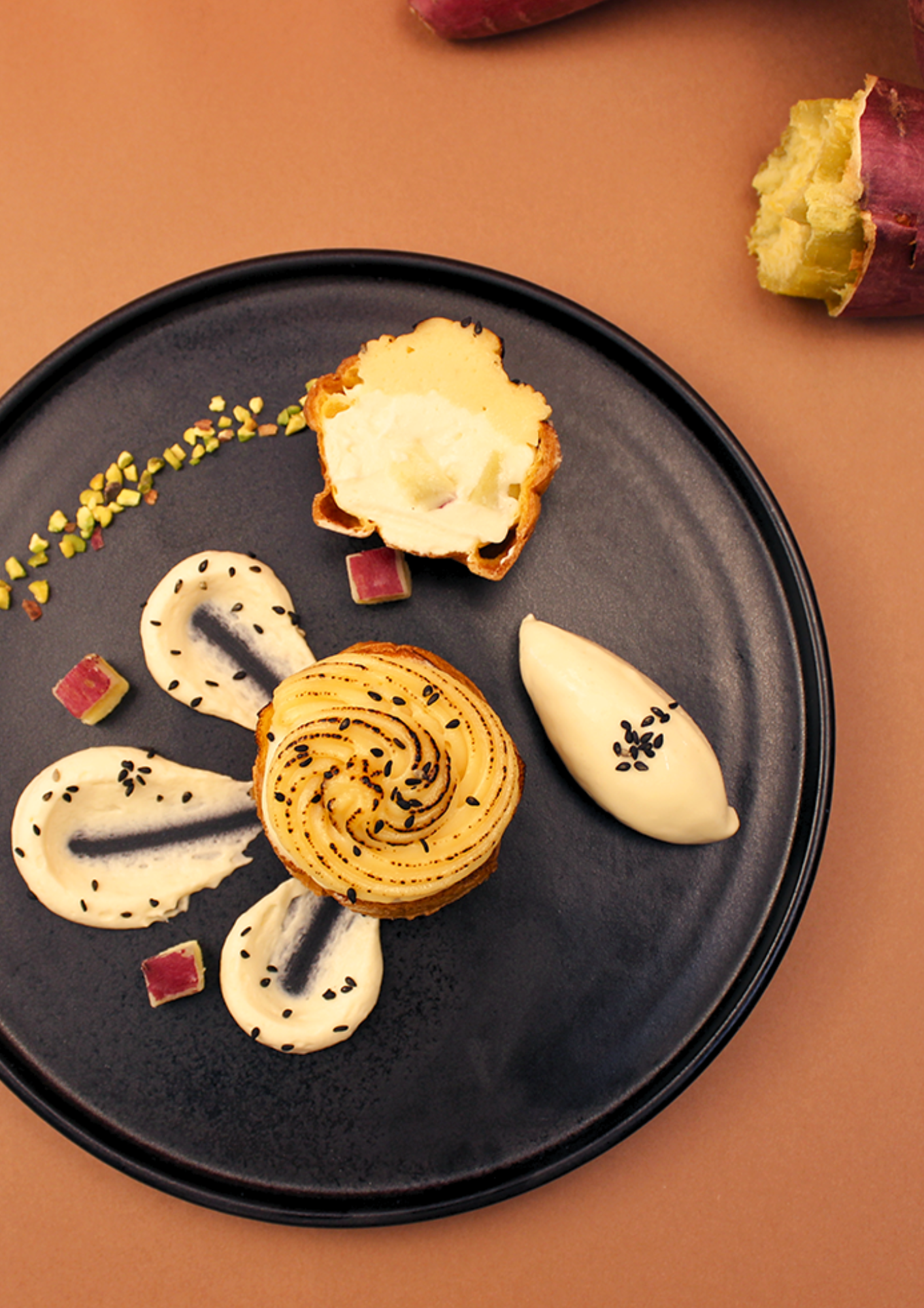 濃厚でなめらかなカスタードクリームに、低温でじっくりと焼き上げ、焼き芋にしてからペースト状にしたさつまいもを合わせ、食感のアクセントにダイス状のさつまいもを加えました。