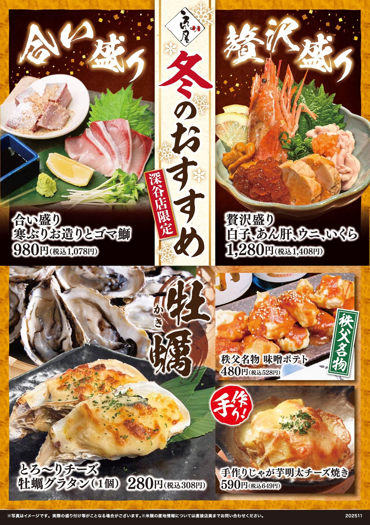 海鮮居酒屋「鮨のえん屋」では埼玉深谷店限定にて、冬のおすすめメニューを12月1日(月)より開始いたします。寒ぶりとゴマ鰤の「合い盛り」、白子・あん肝・ウニ・いくらの「贅沢盛り」に埼玉県秩父地方の名物料理・味噌ポテトなど5種類の期間限定メニューを揃えました。この機会にお楽しみください。皆様のご来店をスタッフ一同、心よりお待ちしております。