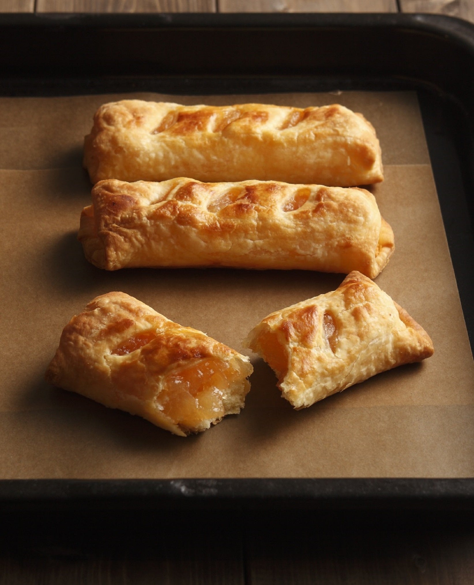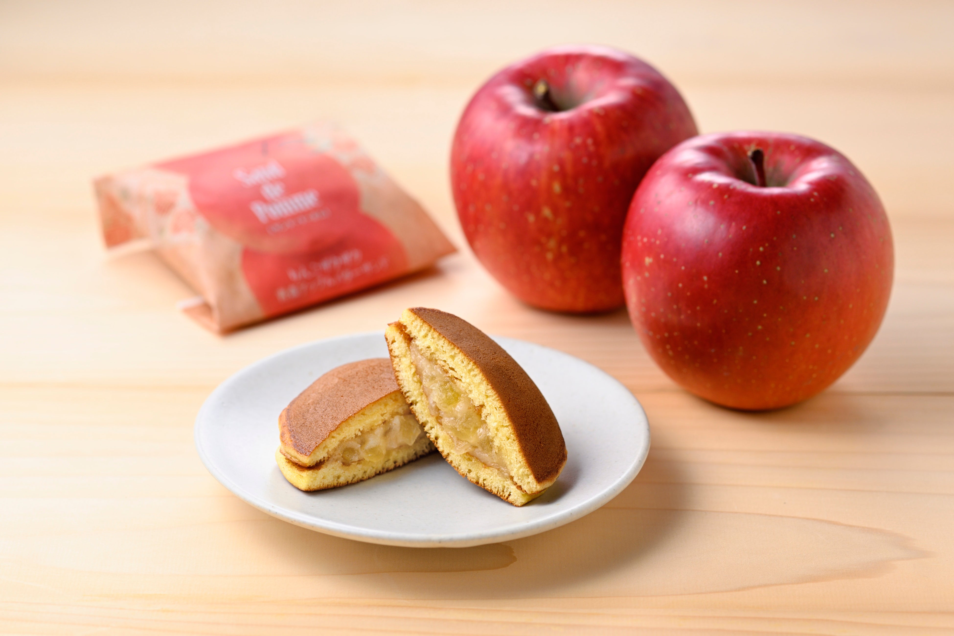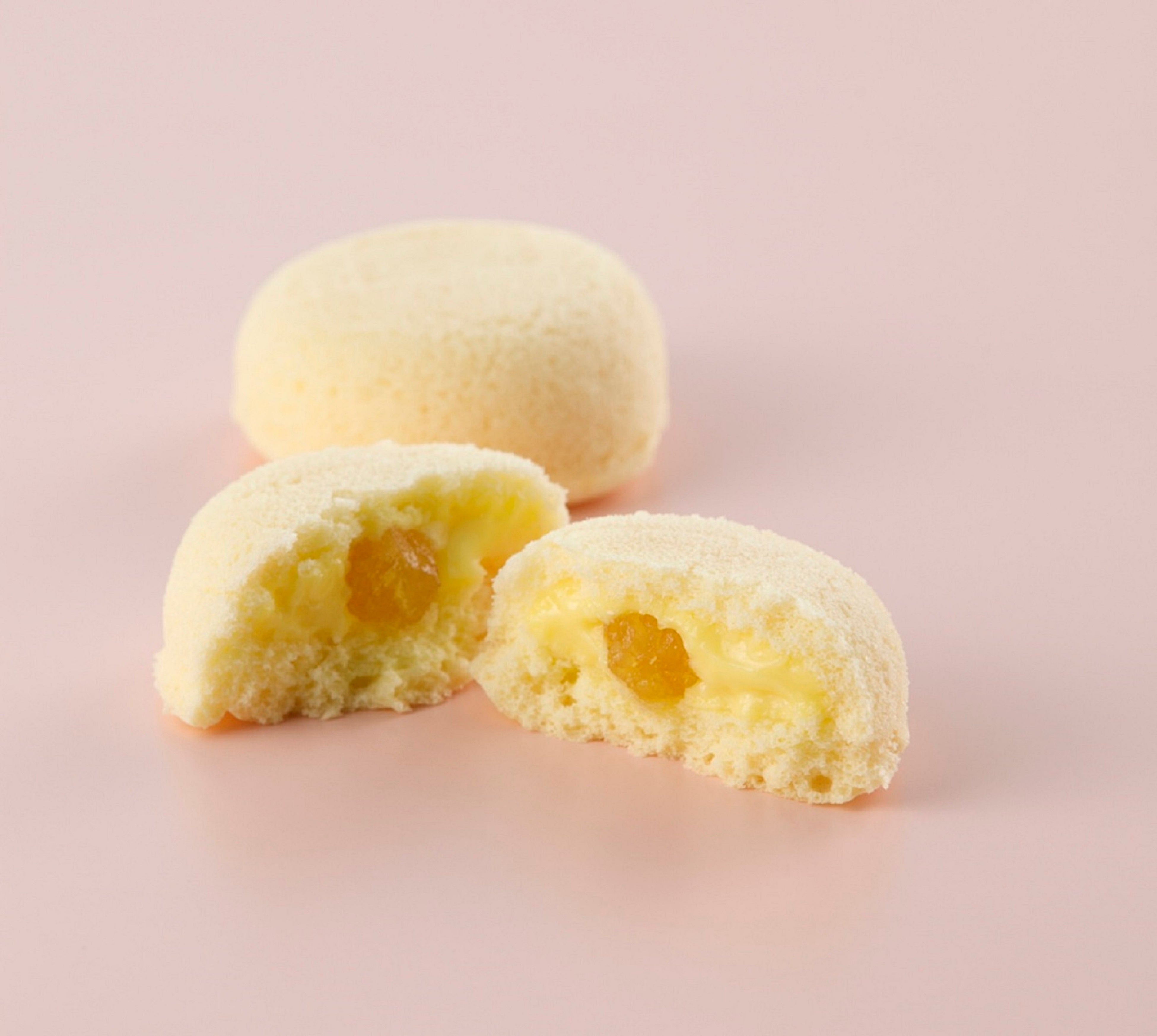 カスタードクリームを柔らかな蒸しケーキで包み、中心に果肉入りアップルソースをいれたカスタードケーキです。
