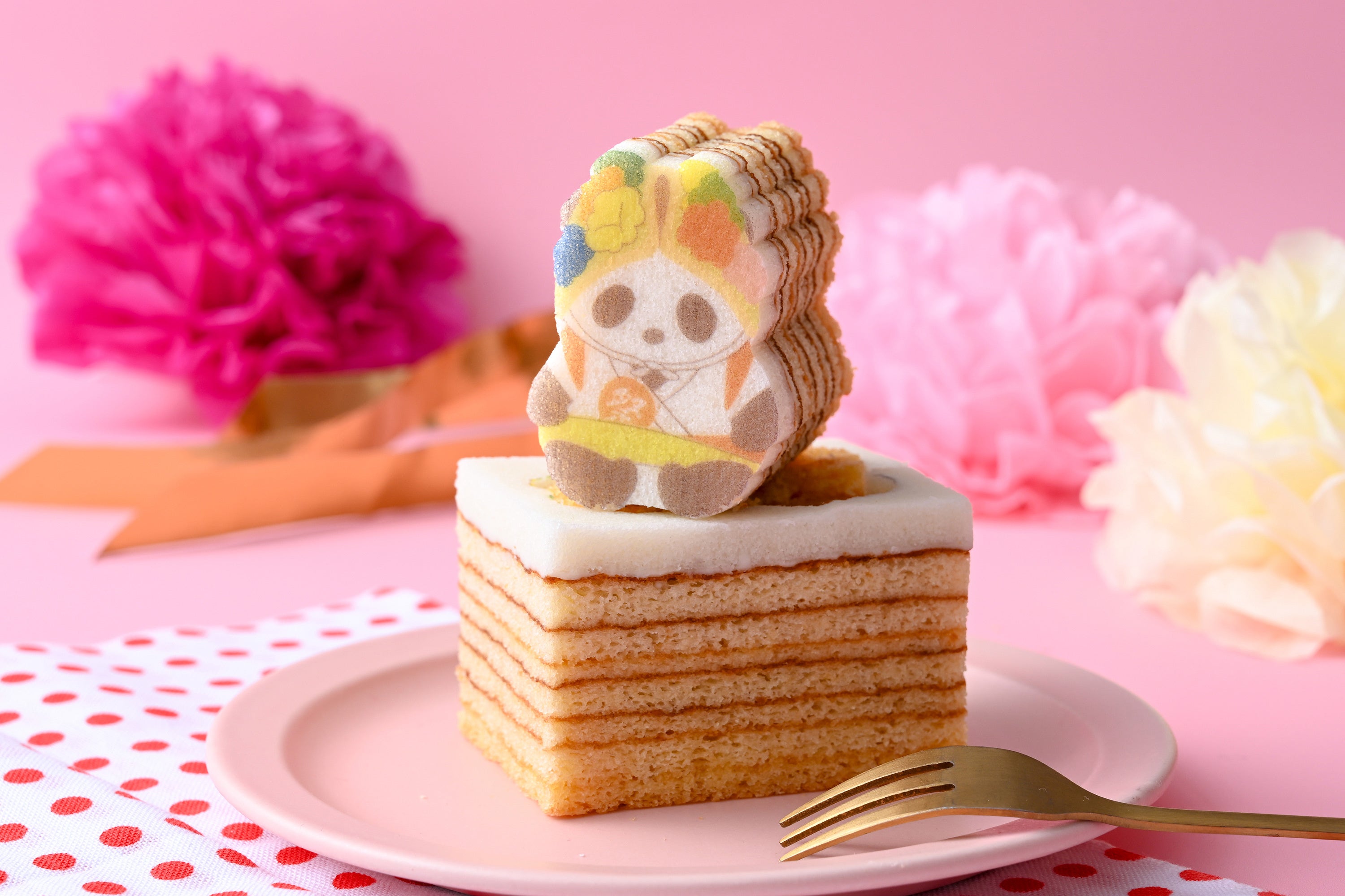 卵とアーモンドがふんわりと香るプレーン生地を、丁寧に焼き重ねた平焼きバウム。ねぶた祭の跳人(ハネト)にふんしたパンダのプ