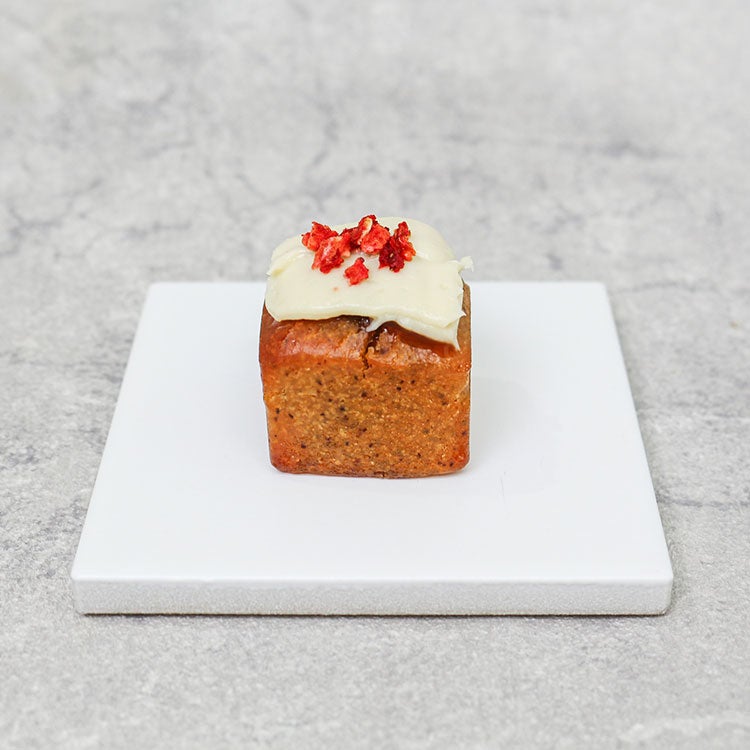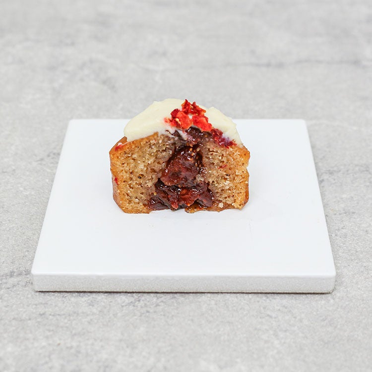店内でじっくり煮詰めた特製いちごジャムを閉じ込めた、ヴィーガン&グルテンフリーのフィナンシェケーキ。香り高いバニラビーンズと米粉を使ったしっとり生地に、豆乳ヨーグルトベースのやさしいヴィーガンフロスティングを重ね、仕上げにフリーズドライいちごをトッピングしています。