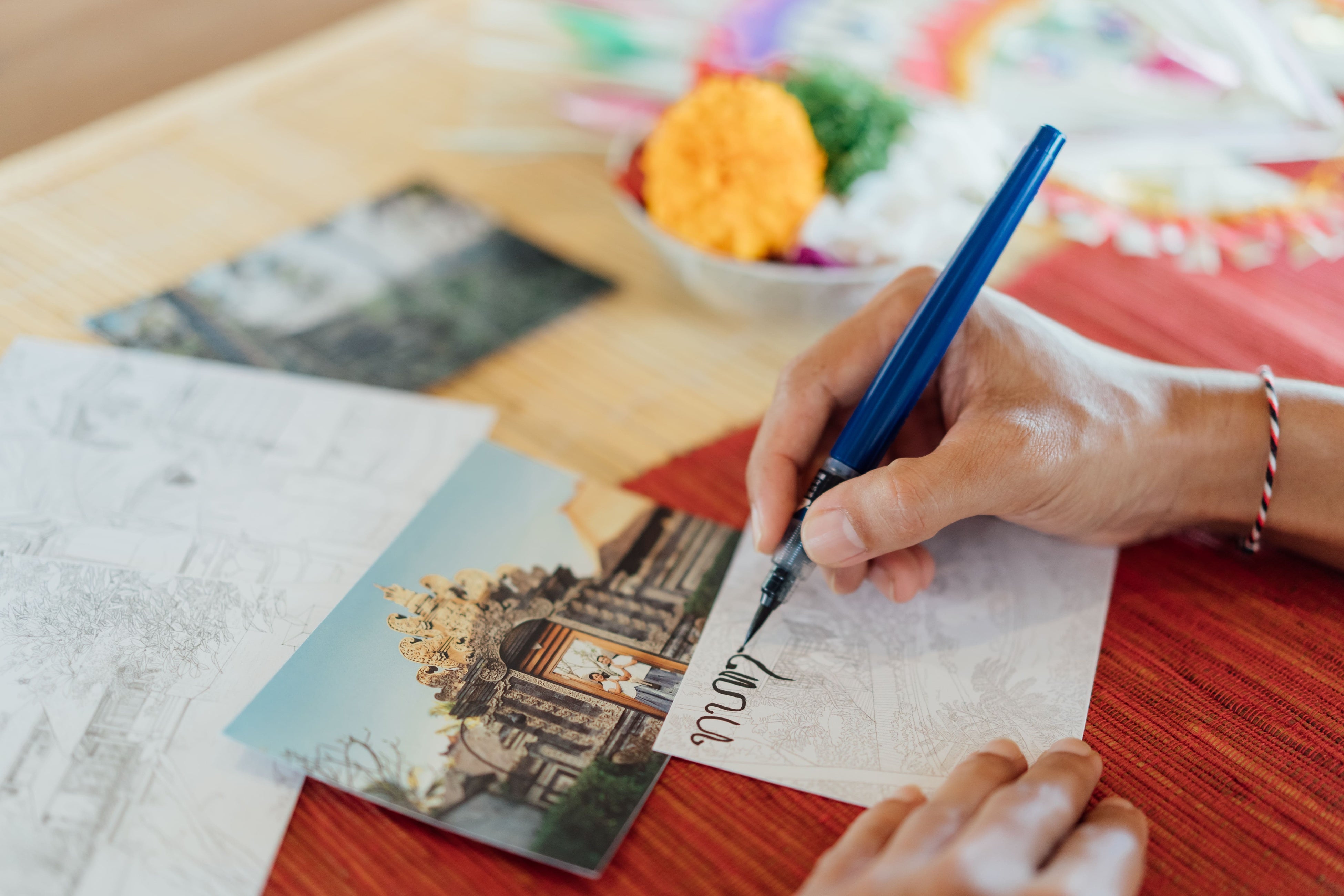 期間中、リゾート内はバリ島のお祝いごとをテーマに華やかに彩られます。エントランスは、まるでバリの結婚式を思わせる装飾でお客様をお出迎えします。お祝いに欠かせないヤシの葉で作った「タミアン(楯の意)」、毎日お寺に捧げる花を用いた「チャナン(お供物)」を作成できます。また、今年は新たに「バリの年賀状」を開催します。バリの建築様式に則った石の門など、星のやバリを象徴する風景のカードに色を塗ります。地元スタッフからバリ語を学んで文字をしたため、大切な人へ贈る年賀状を仕上げます。