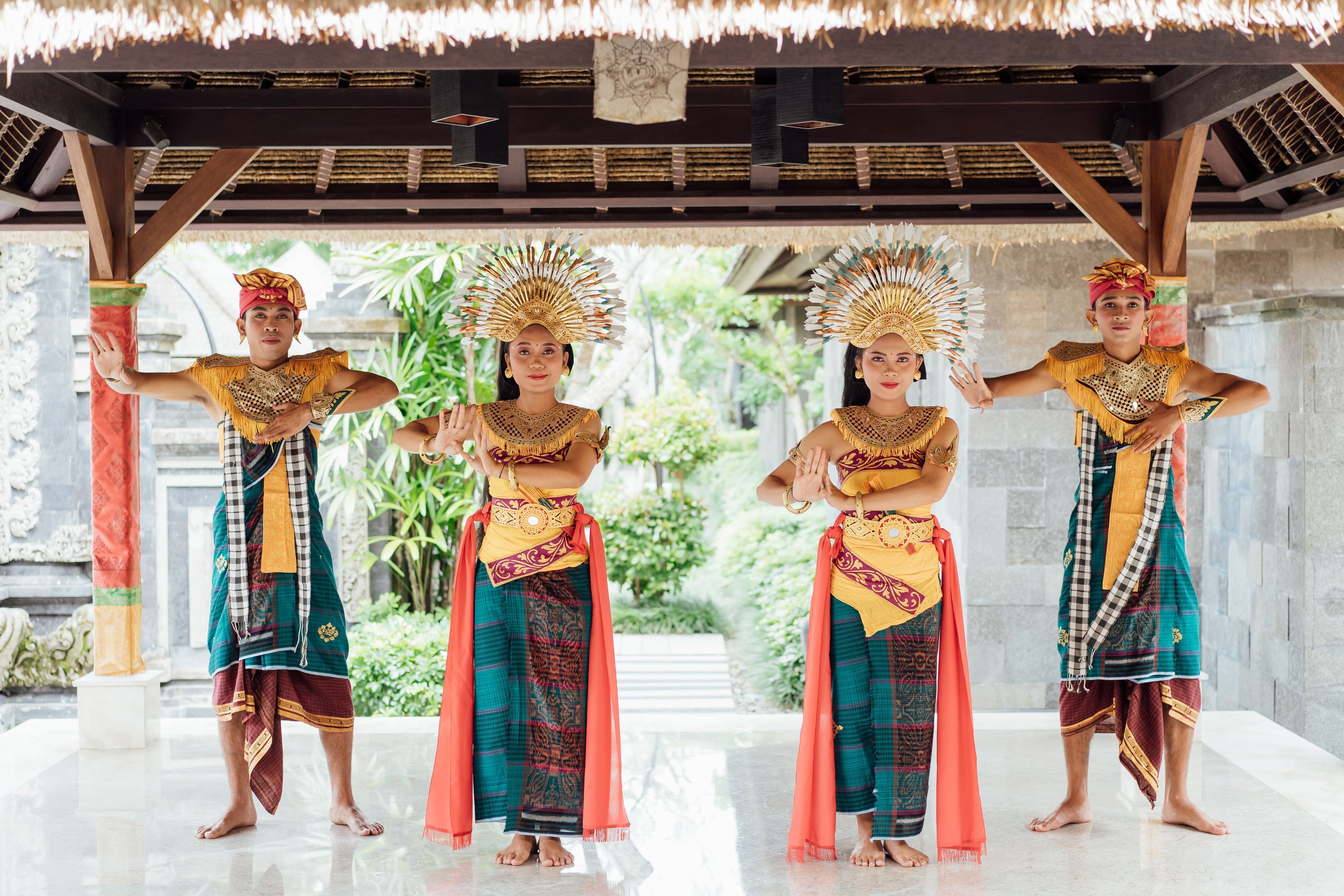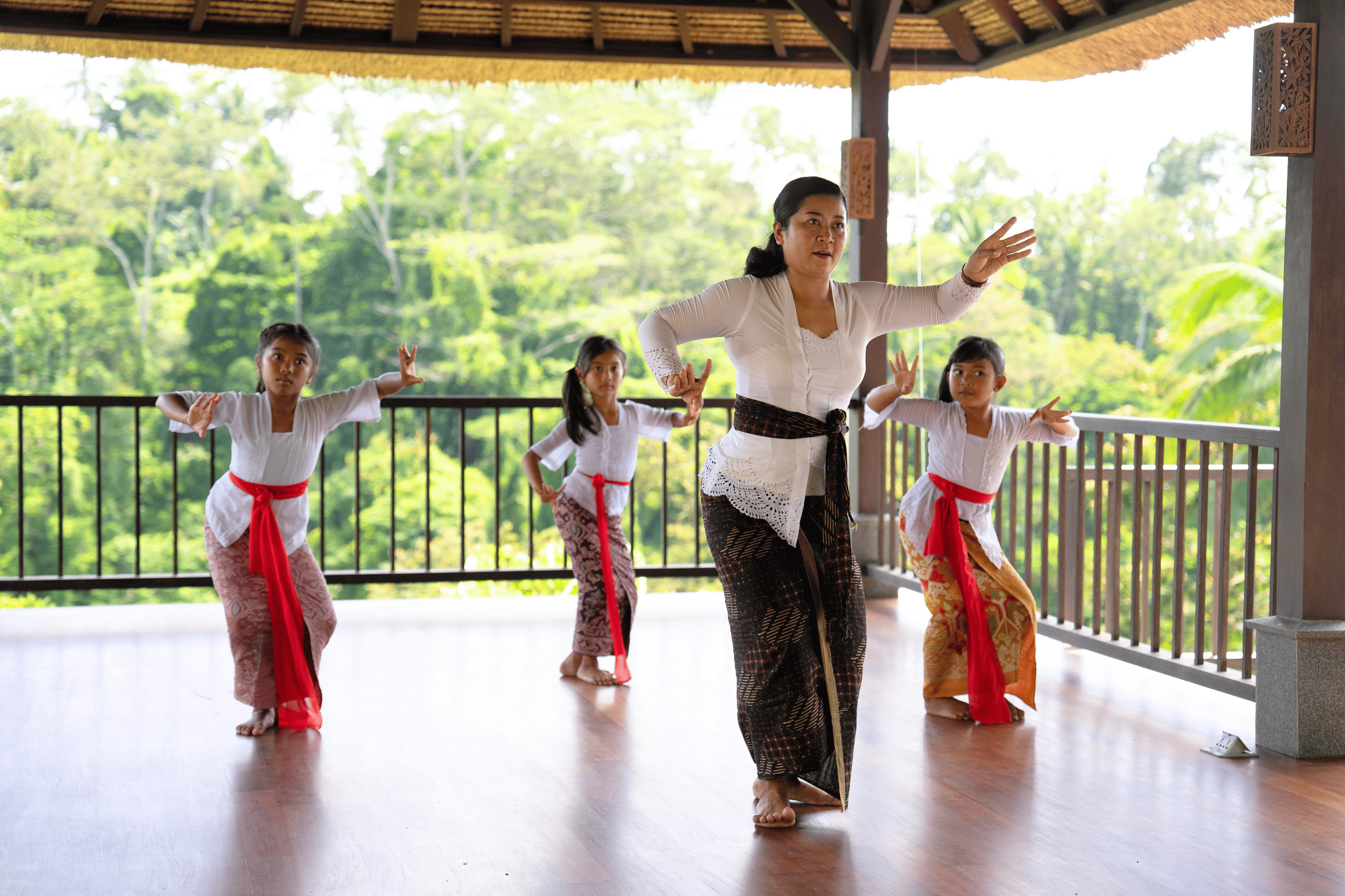 お子様は、バリの伝統の衣装を身に付け、地元出身のスタッフが楽しく手ほどきする「お子様向けバリ舞踊レッスン」に参加できます。さらに、クリスマスイブと大晦日には、バリの伝統舞踊「ジャンゲール・ダンス」を披露します。このダンスは、男女のカップルが歌と踊りを通じて交流する社交的な芸能です。共同体(バンジャール)の歓びや一体感を表現する際にバリ島で広く上演されます。新年をバリ島で迎えられるすべてのお客様と共に来る年を祝福し、明るい一年を祈念する想いを込め、地元の3組の踊り手が上演します。