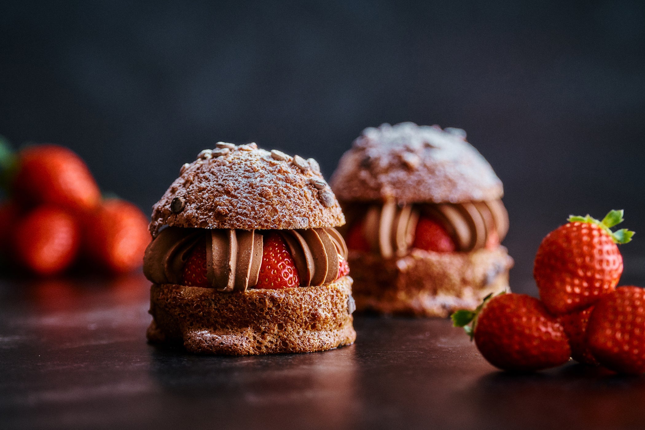 ヘーゼルナッツの自家製クリームを塗って焼きあげた、外はサクサク、中はふわふわのオリジナルのパネトーネ。ホテルオリジナルのチョコレート「Grande H」のチョコレートクリームといちご、なめらかなカスタードクリームのクレーム パティシエールをサンドしました。香り高いカカオの香りが口の中に広がり、いちごの酸味とクレーム パティシエールの甘みのマリアージュを口いっぱいにお楽しみいただける、贅沢な一品です。