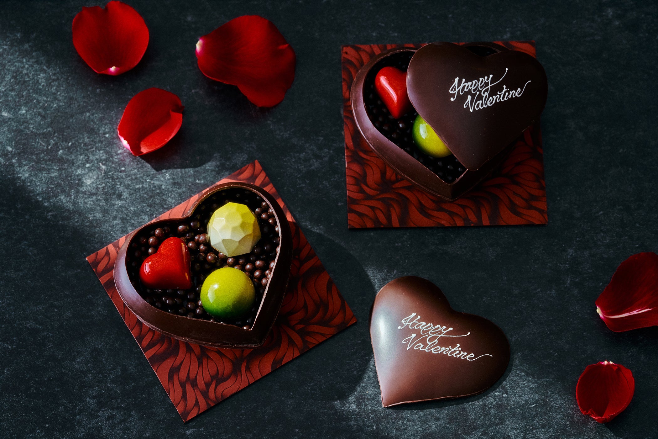 ホテルオリジナルのチョコレート「Grande H」をつかい、ひとつひとつ手作業でつくるハート型のショコラボールに、パイナップルとココナッツの香りが口いっぱいに広がるアナナスココやベルガモット、ストロベリーのボンボンショコラを忍ばせます。3種のボンボンショコラの下には香り豊かなアマンディーヌとパールチョコレートをふんだんに敷き詰めました。今年は、チョコレートの土台にもバラの花びらの模様を施し、華やかに仕上げます。