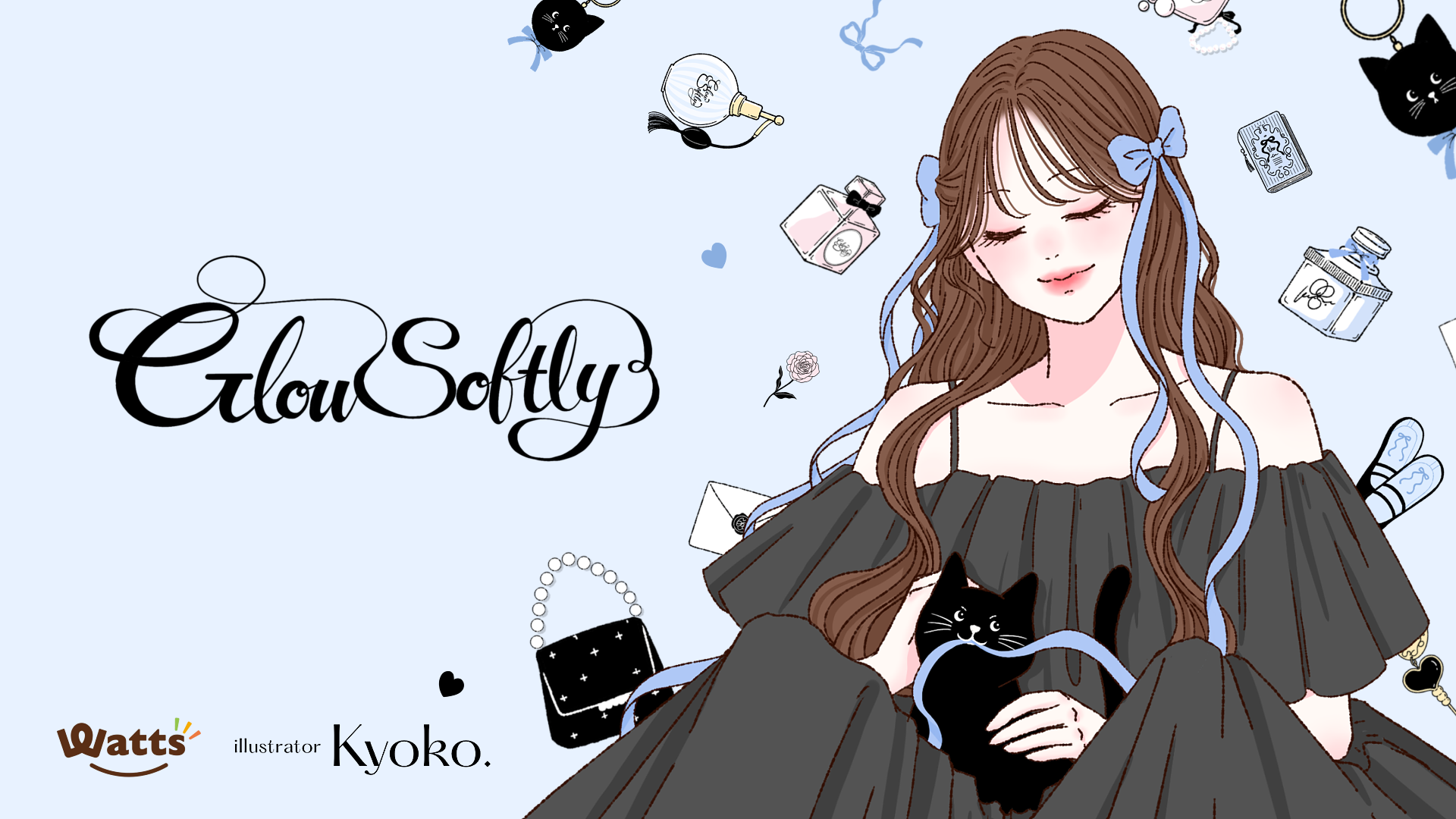 女性らしさや可愛らしさを兼ね備えた女性をコンセプトとした作品で人気のイラストレーター Kyoko. さんと、ワッツが初のコラボレーションを実現いたしました。今回のテーマは “Glow Softly”。