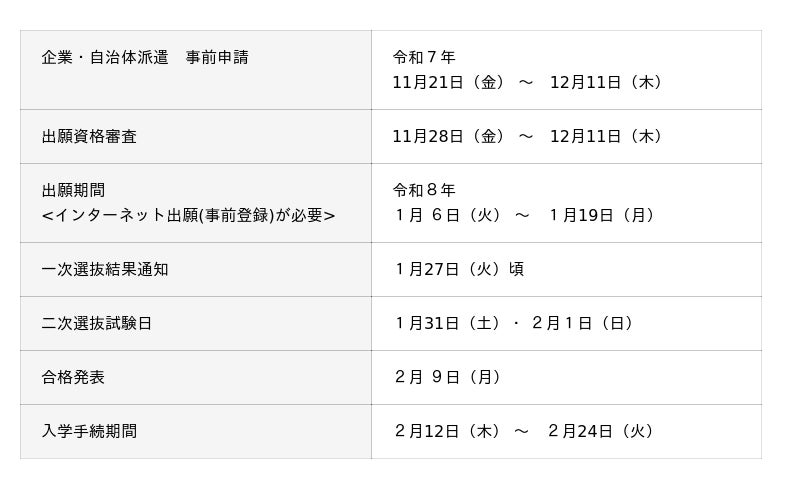 大学の学部等を卒業していない方は、出願前に別途、出願資格審査が必要です。