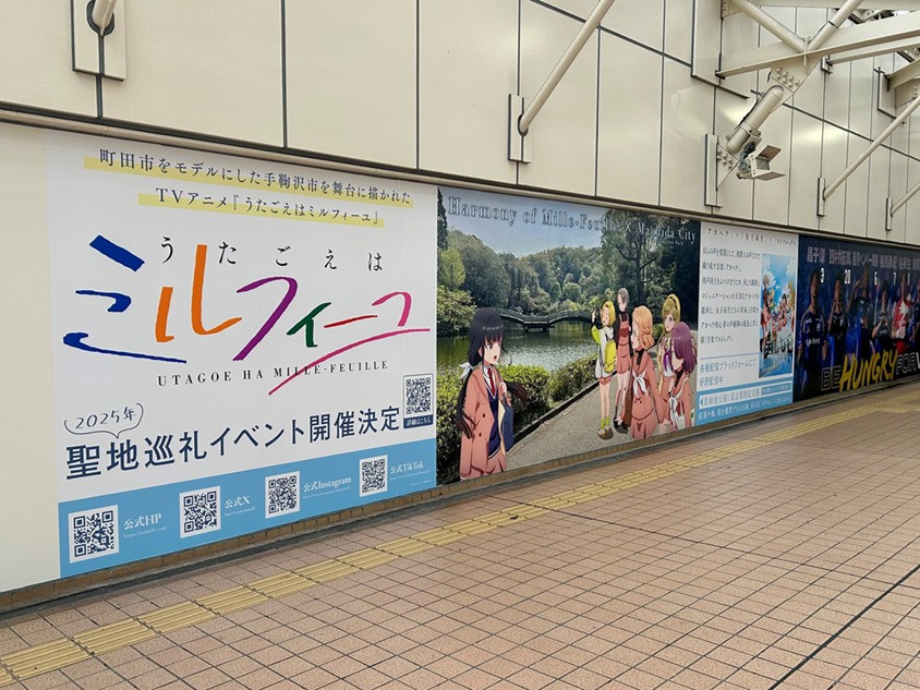 町田駅前ペデストリアンデッキ 1号デッキ 壁面ラッピング描き下ろしコラボイラストを使用した【横10m×縦2.3m】の特大ラッピングを掲出中!