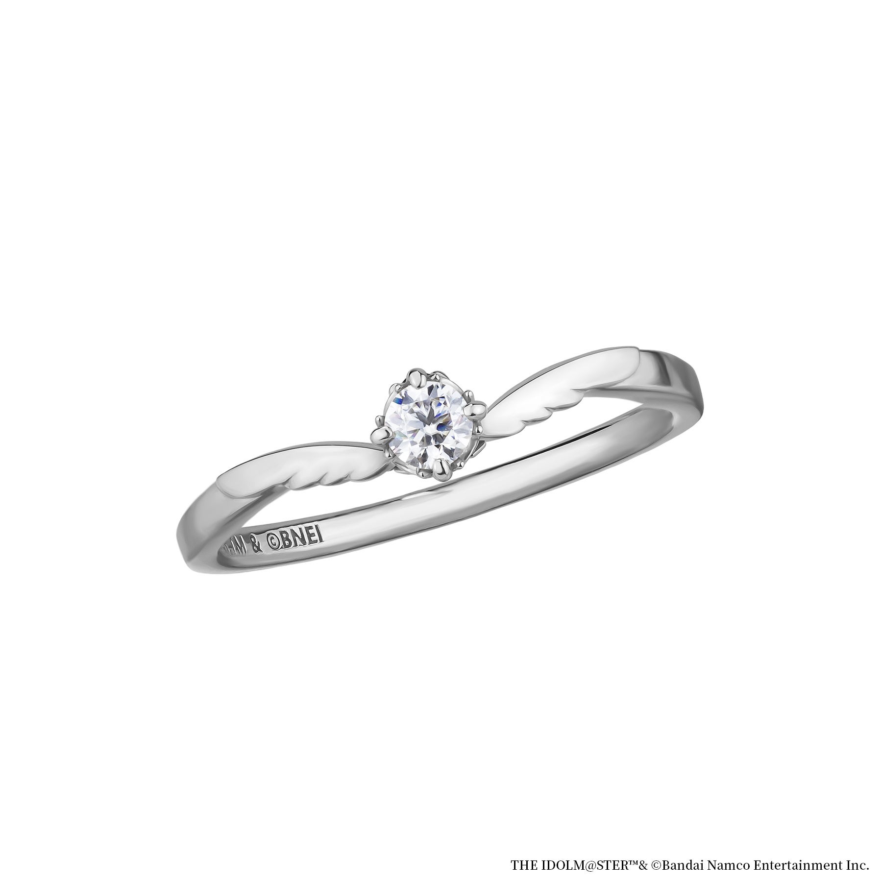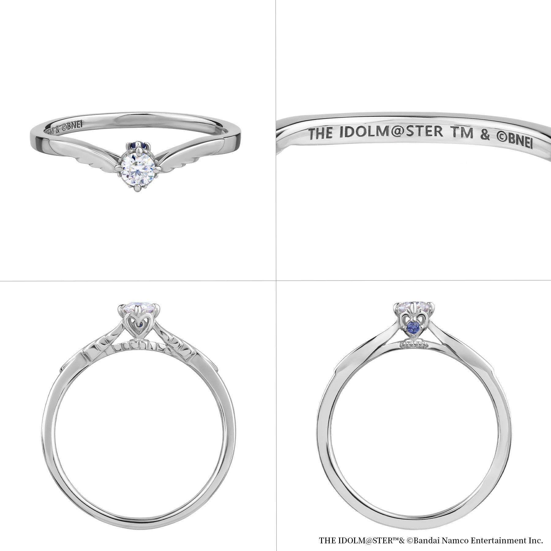 ペガサスマークからインスパイアされたハートと羽をメインに、「アイドルマスター シンデレラガールズ」を象徴するような魅力的なデザインに仕上げました。センターには地球上で最も輝くと言われる「モアサナイト」をセッティングし、何よりも輝きを放つアイドル達と、何年経っても変わらないプロデューサーの絆を表しています。また、石座側面にはプラチナ900はサファイヤ、シルバーはサファイヤカラーのキュービックジルコニアをセッティングしました。アームにはペガサスの羽をデザイン。プロデューサーによって成長し、大きく飛躍していくアイドル達の姿をイメージしています。繊細かつ立体的なデザインで高級感溢れるリングは、プロデューサーとアイドル達が歩んできた軌跡を象徴しているのはもちろん、プロデューサーが普段使いでおしゃれに着けて楽しむこともできるアイテムです。