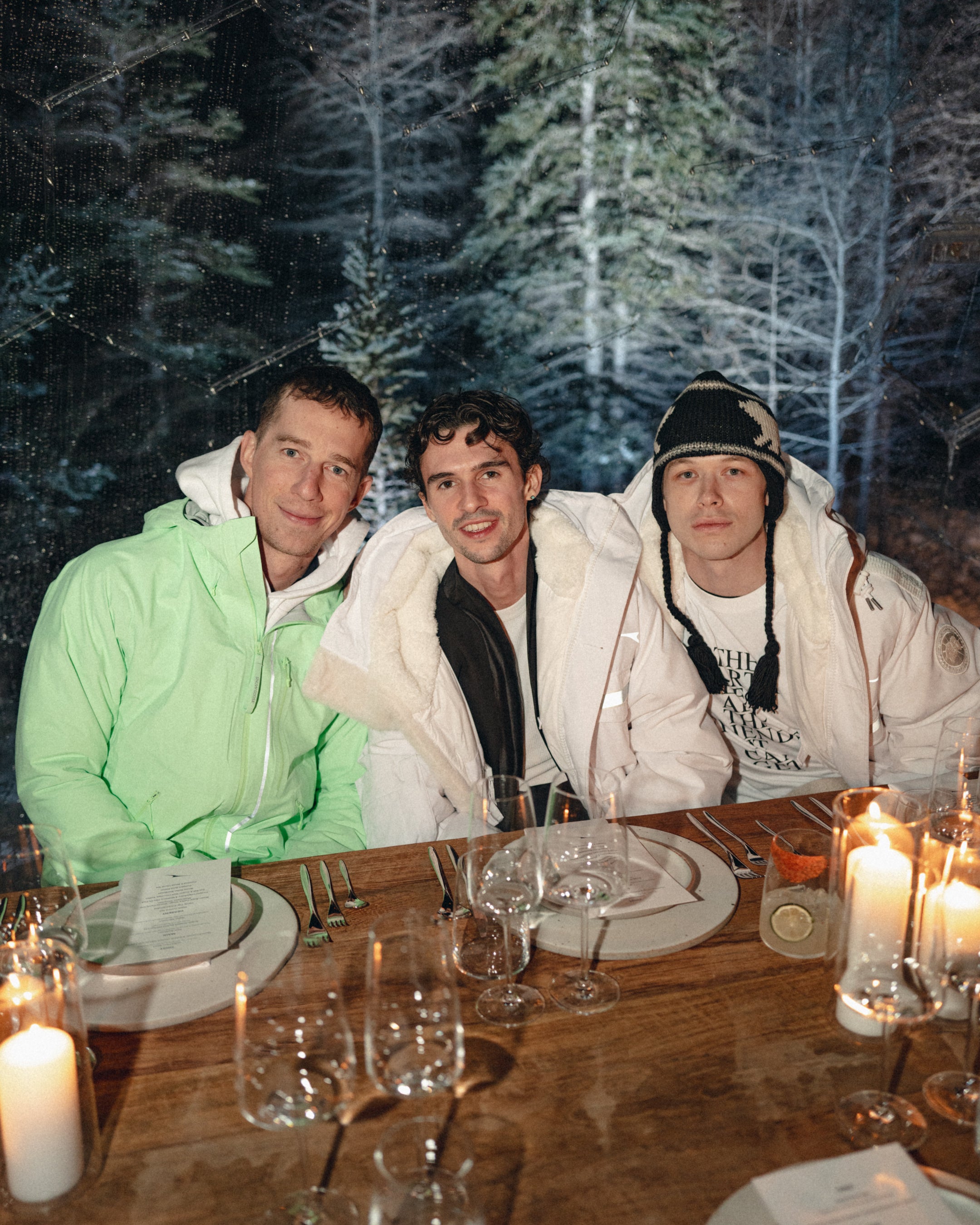 雪景色の中、2025年秋冬「SNOW GOOSE BY CANADA GOOSE」コレクションを着たゲストたちが記念の一枚を残すひとコマ