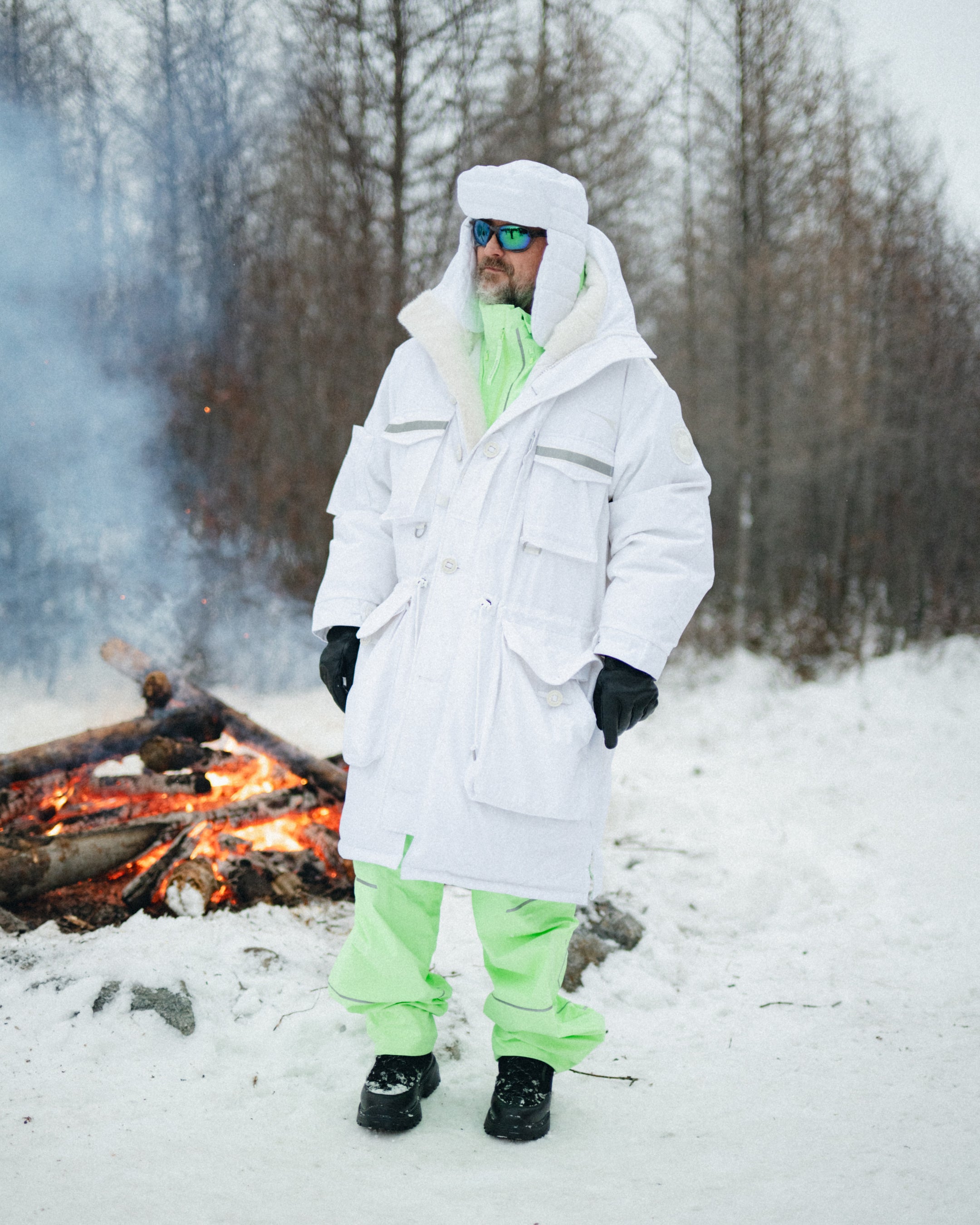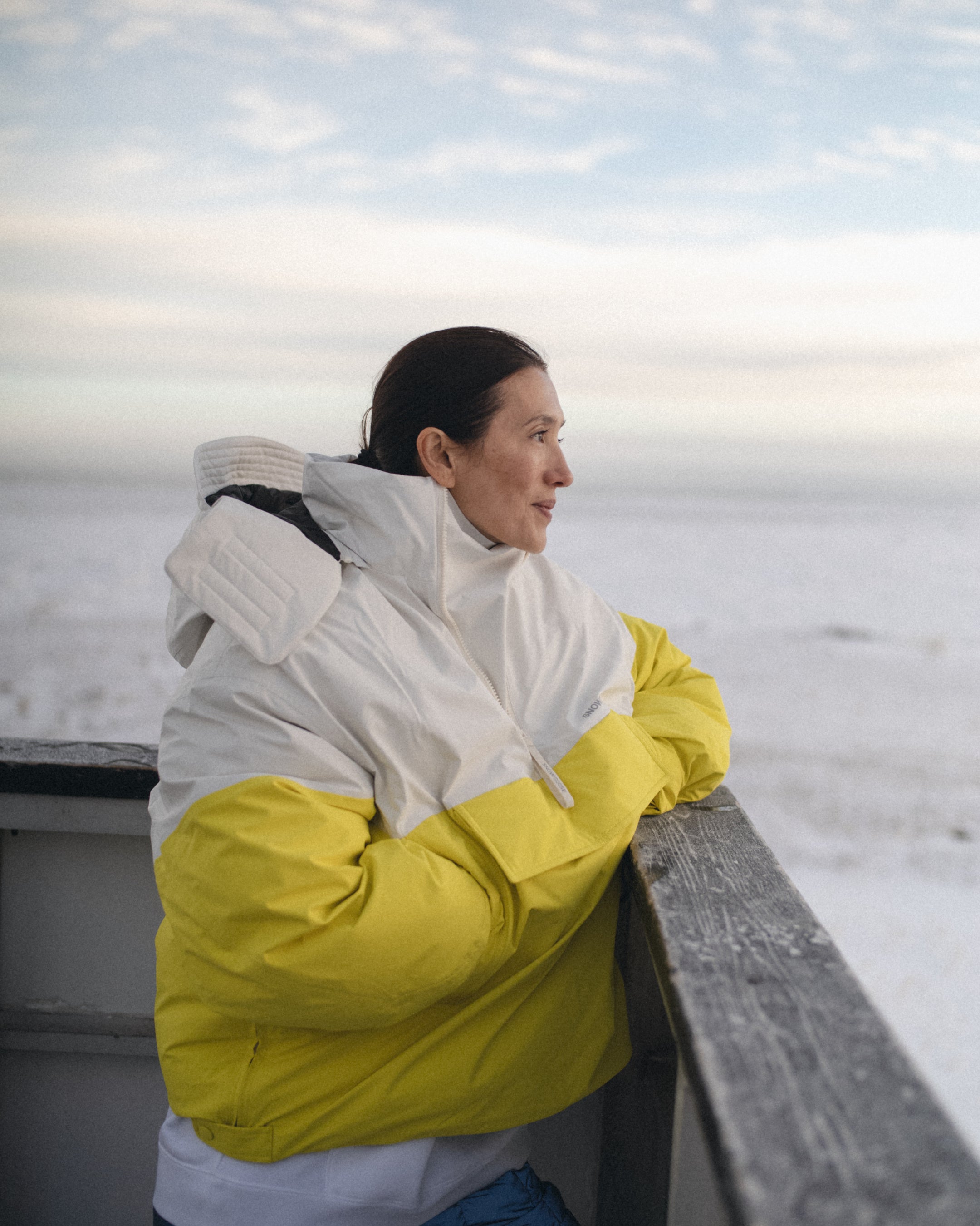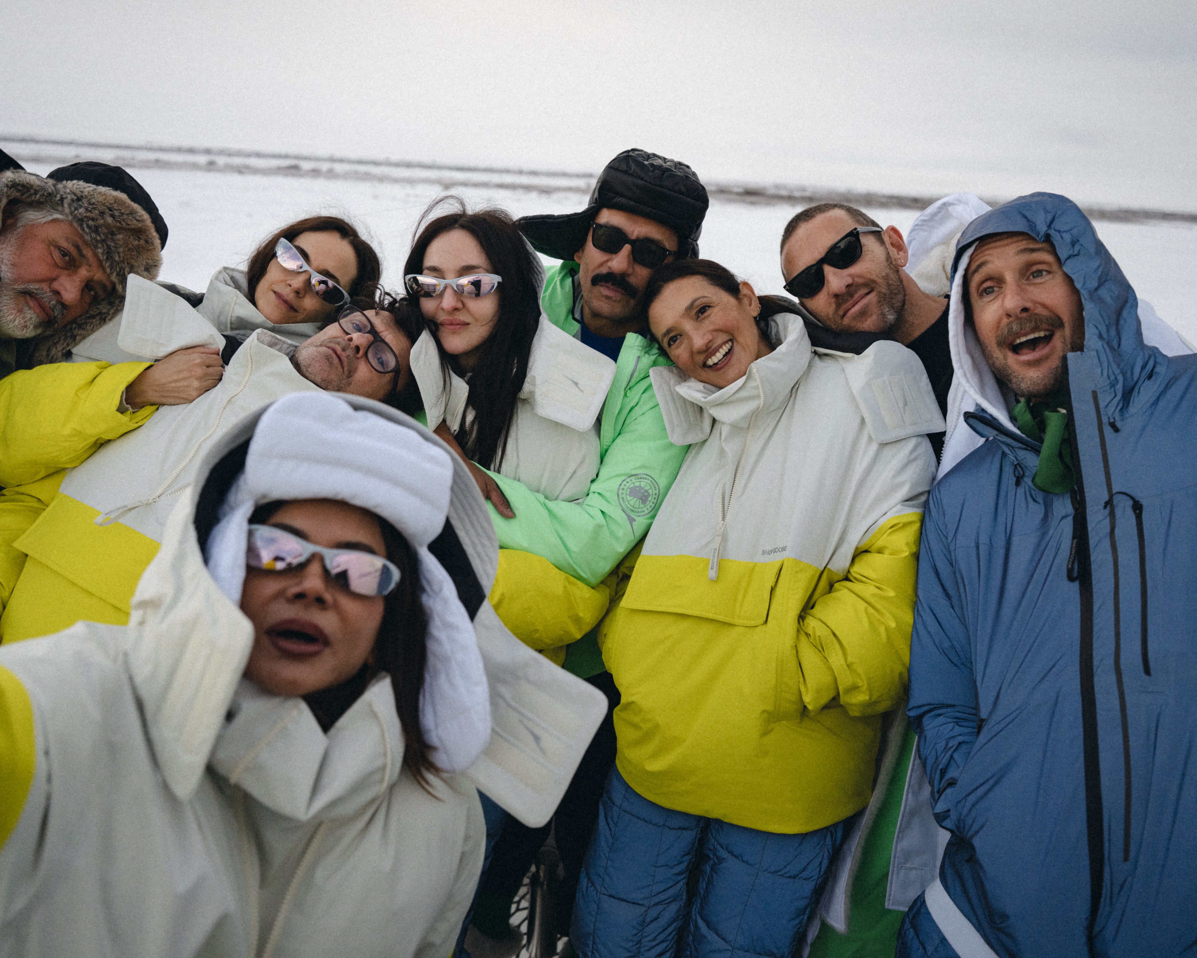 遠征に参加したゲストたちは、2025年秋冬「SNOW GOOSE BY CANADA GOOSE」コレクションを着用。雪景色に溶け込むオールホワイトのパーカ、ハドソン湾の海氷を映すブルー、雪の中で鮮やかに映えるイエローや蛍光グリーンのアクセントなど、カナダグースならではの美しいカラーと高い機能性を体感しました。