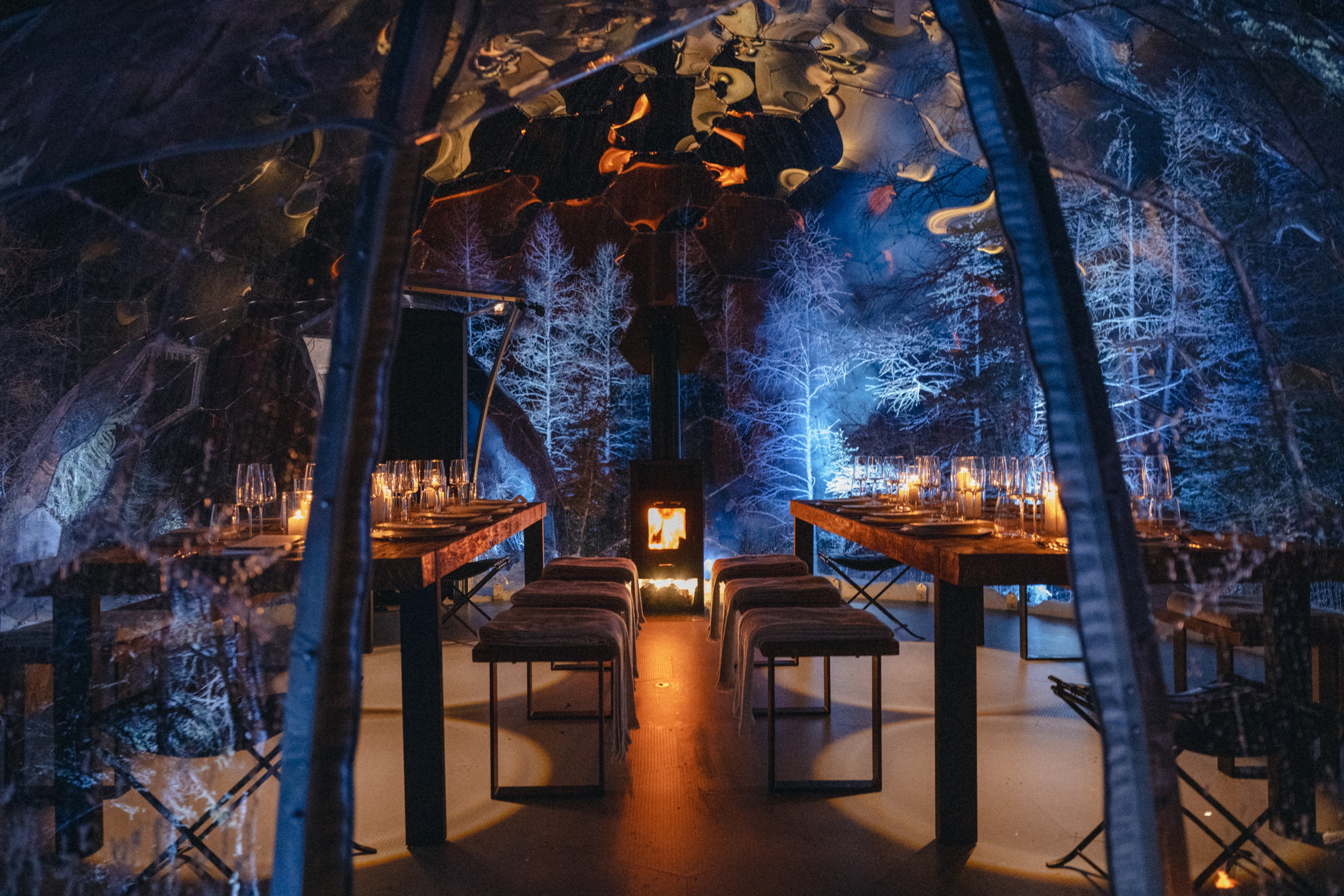 キャンドルライトに照らされ、ゲストたちがフォレストドームでのディナーを楽しむひととき