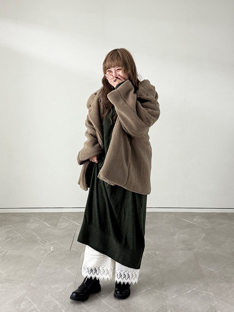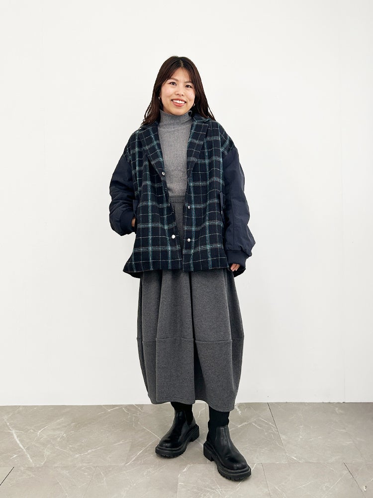 体型カバーとおしゃれを両立できるコクーンスカートも、裏シャギー素材なら真冬仕様に。丸みを帯びた立体的なフォルムでも暖かさをキープし、リラックス&モードを叶えるコーディネートです。
