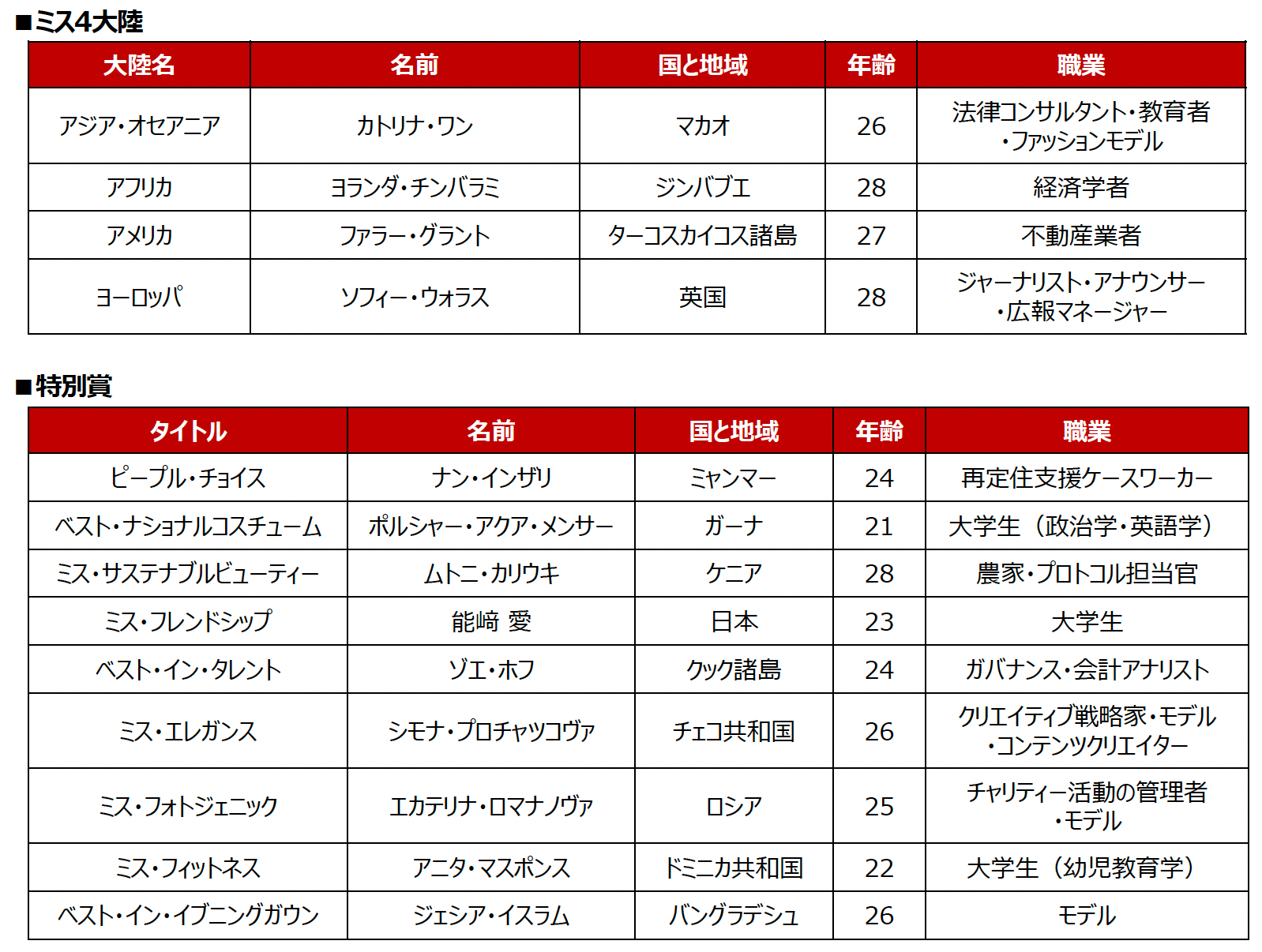 また、2位から5位までの入賞者に加え、ミス4大陸(アジアパシフィック/アフリカ/アメリカ/ヨーロッパ)、特別賞(ピープル・チョイス、ベスト・ナショナルコスチューム、ミス・フレンドシップ、ベスト・イン・タレント、ミス・エレガンス、ミス・フォトジェニック、ミス・フィットネス、ベスト・イン・イブニングガウン)、そして今年新設された「ミス・サスティナブルビューティー」の受賞者も選出されました。