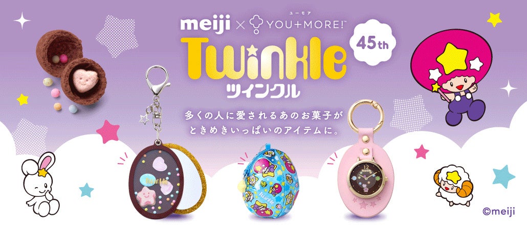 フェリシモが展開するユーモア雑貨ブランド「YOU+MORE!」は、2025年に45周年を迎えた株式会社 明治(本社:東京都中央区 代表取締役社長:八尾文二郎)とのコラボ企画として、いつの時代にも女の子の憧れが詰まった人気チョコレート・明治「ツインクル」の大人向けファンシー雑貨のウェブ販売を11月28日より開始します。星の国からやってきた妖精・ツインクルが描かれたカラフルでメタリックな銀紙デザインや、振るとシャカシャカ音が鳴るツインクルの楽しさをそのまま再現した「お星さまのキラキラたまごツインクルポーチ」「ツインクルのアクリルミラーキーホルダー」「ツインクルのチャームウォッチ」の3点です。