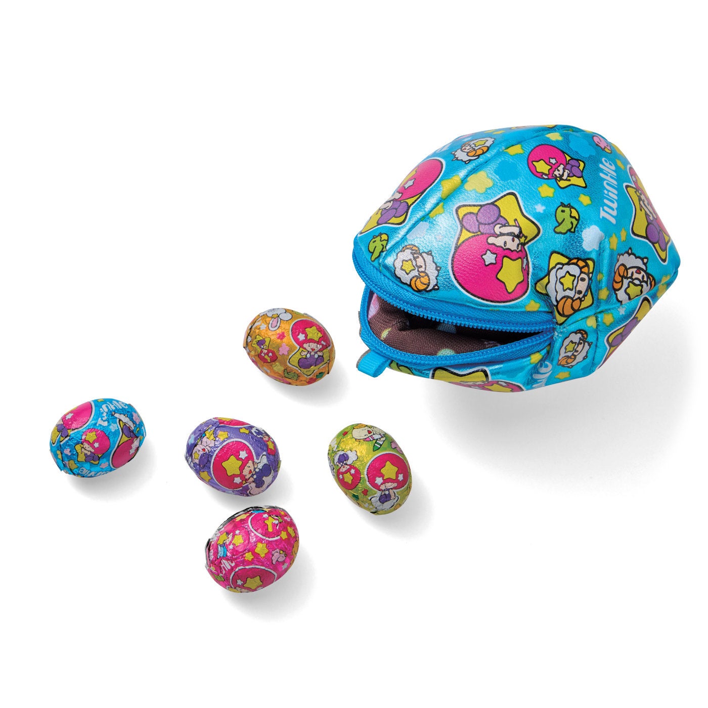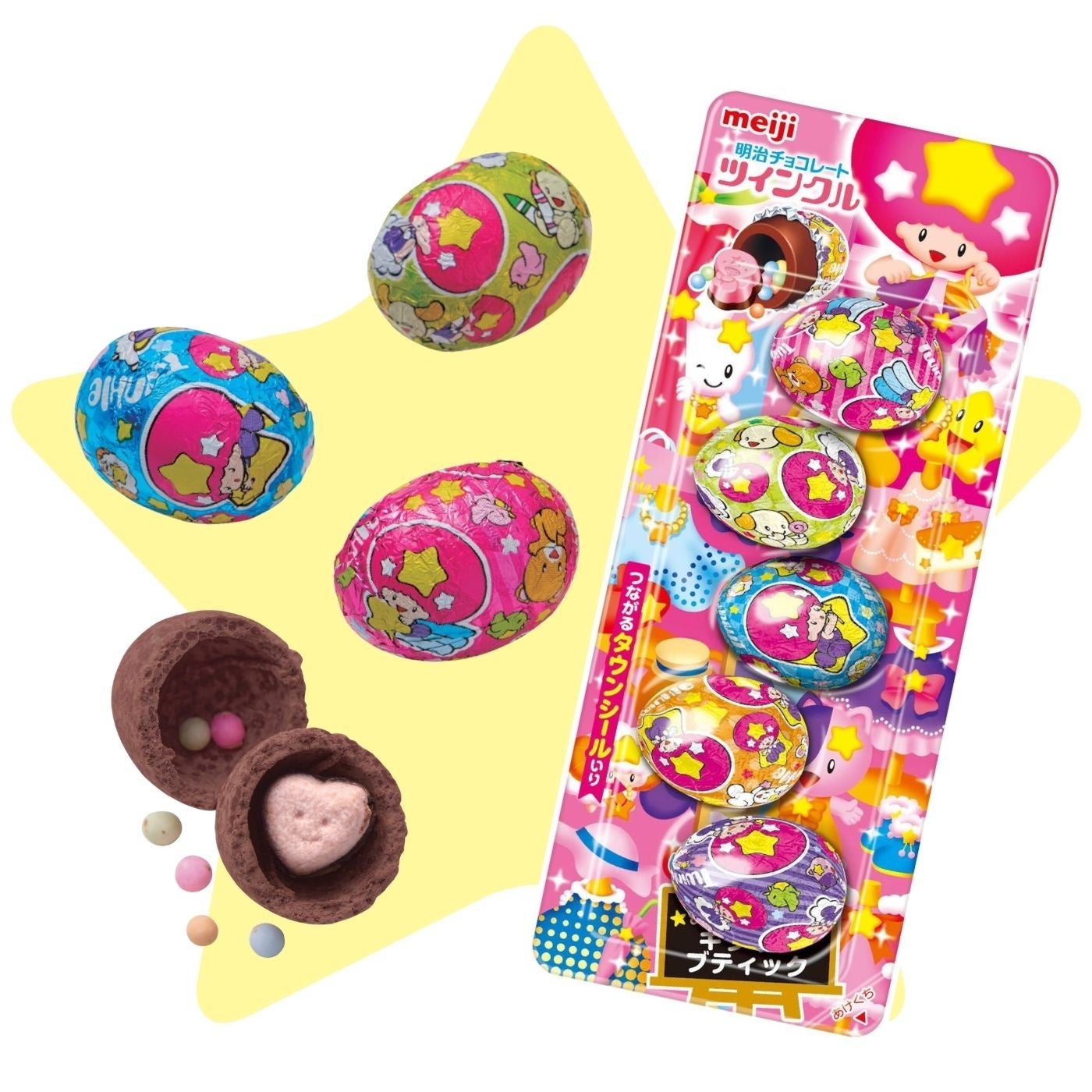 明治「ツインクル」は1980年から発売開始し、1990年代には平成女児たちから人気を集めたたまご型のミルクチョコレートです。カラフルでメタリックな銀紙に包まれたコロンとしたときめき溢れる出で立ちと、振るとシャカシャカと中に入ったチョコレートやラムネ、ミンツの音がなり、食べるまで何が出てくるかわからないワクワクで世代を超えて愛されています。