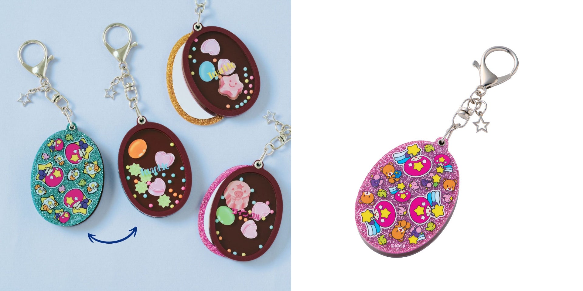振るとツインクルの中に入っているお菓子モチーフがシャカシャカと動くアクリルキーホルダーです。スライドすると中はミラーになっていて、さっと身だしなみチェックもできます。裏面のラメカラーにイラストがプリントされたデザインは、おなじみのツインクルの銀紙をイメージ。小さなかわいい星形のチャーム付きです。いつものバッグやポーチをツインクルで飾ることができます。