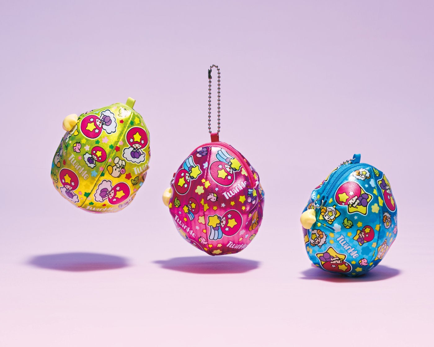 カラフルでメタリックな銀紙に包まれている、たまご形のチョコレート「ツインクル」がそのまま大きくなったようなデザインのポーチです。振ると本物のツインクルと同じようにシャカシャカと音が鳴ります。デザインは、〈流れ星のイエローグリーン〉〈天の川のピンク〉〈夜明けのブルー〉の3種類。乙女心を思い出すきらめく素材感です。