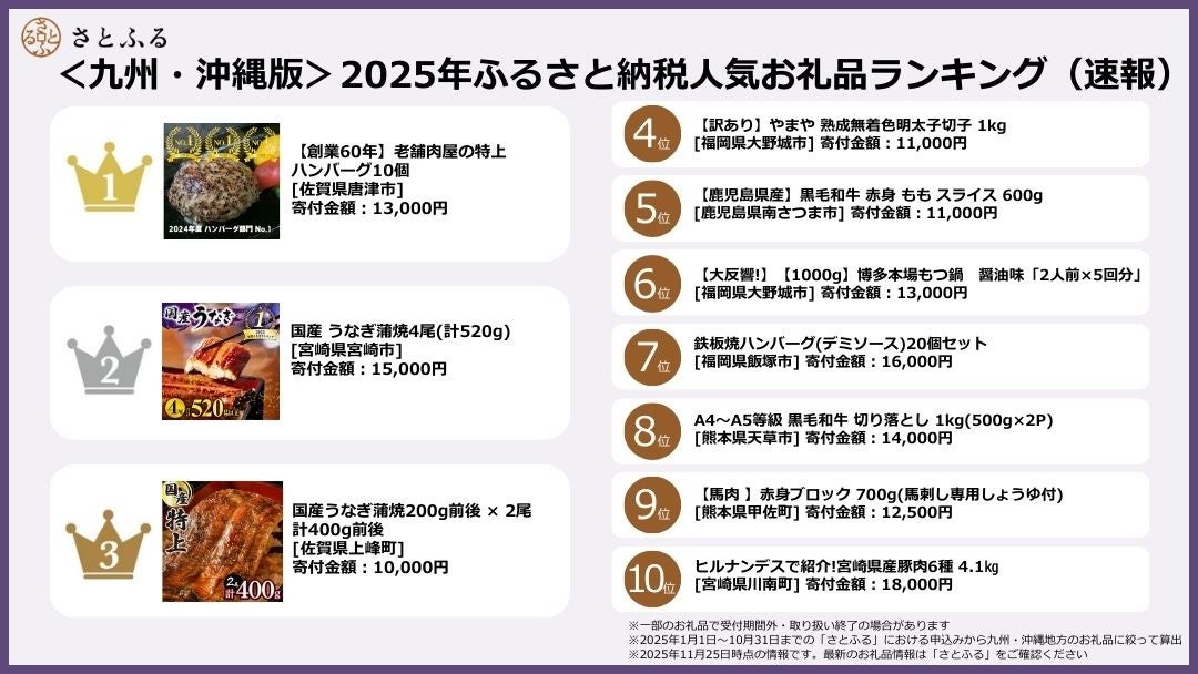 【さとふるニュースレター】<九州・沖縄版>2025年ふるさと納税人気お礼品ランキング(速報)