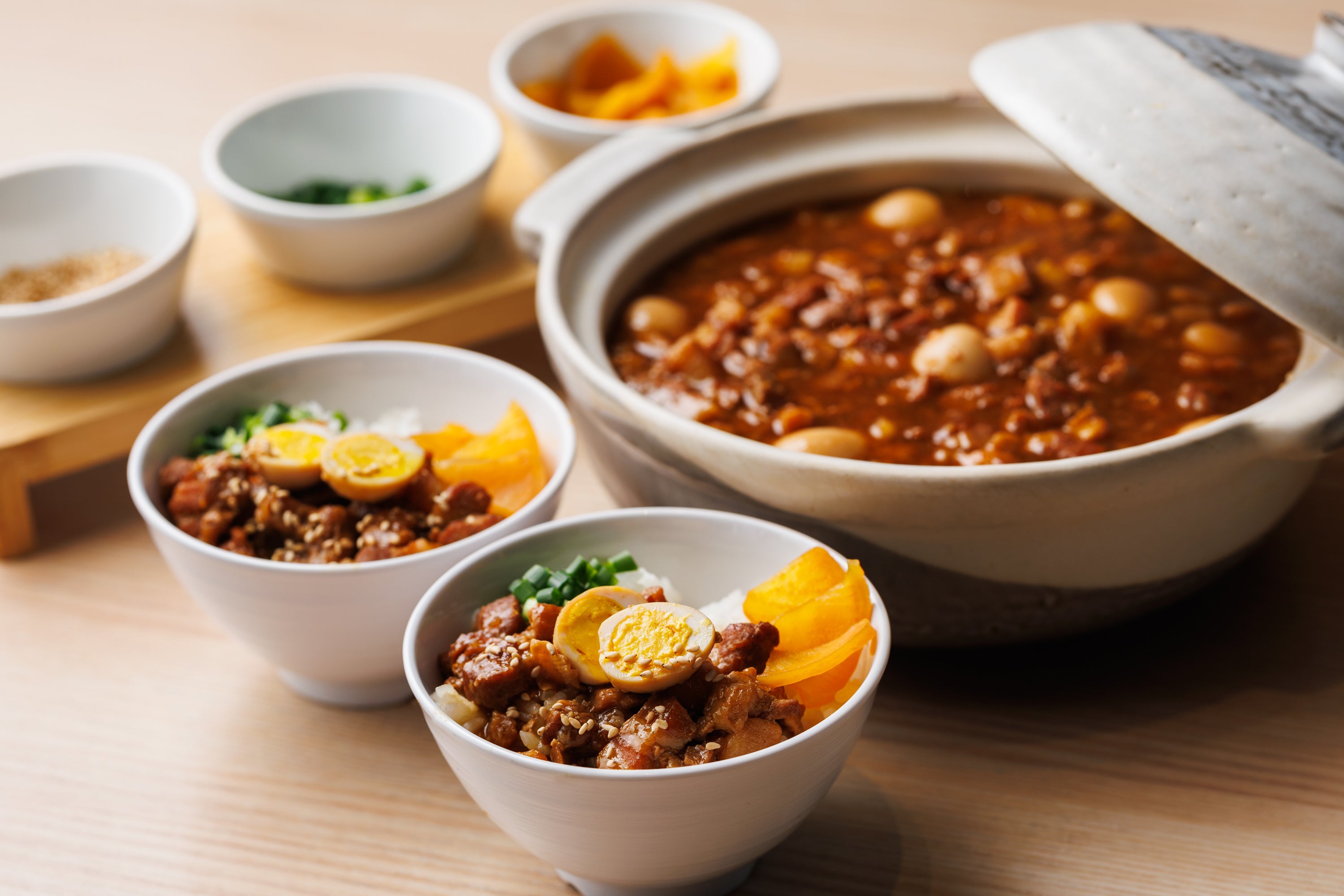 白米の上に具材と煮汁をたっぷりかけて本格的な台湾の味を再現。