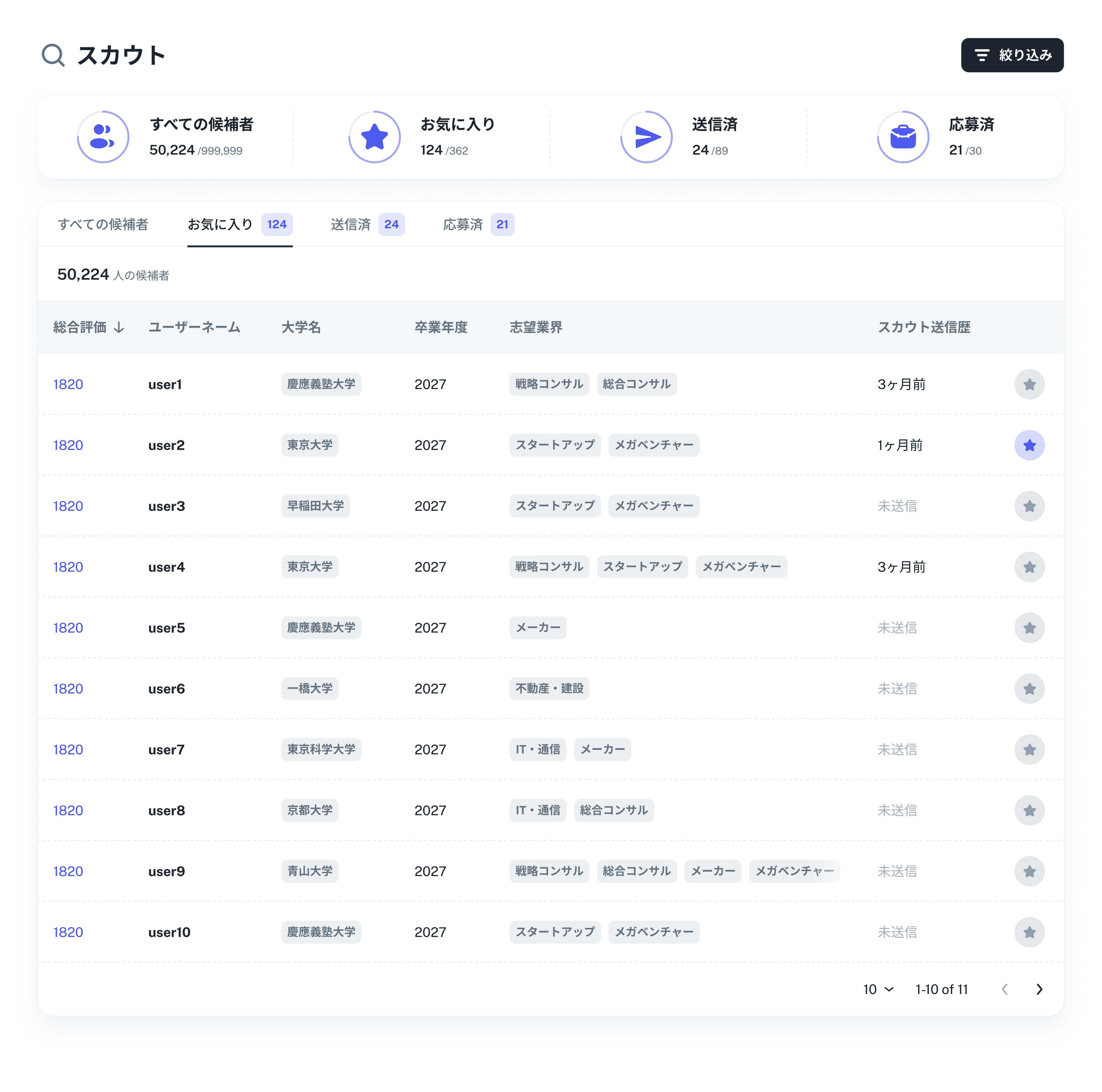 1.他では出会えない質の高い母集団新卒:登録者数1万人超。75%以上が東京一工早慶・海外大などの高学歴層。成長意欲の高い学生が多数。