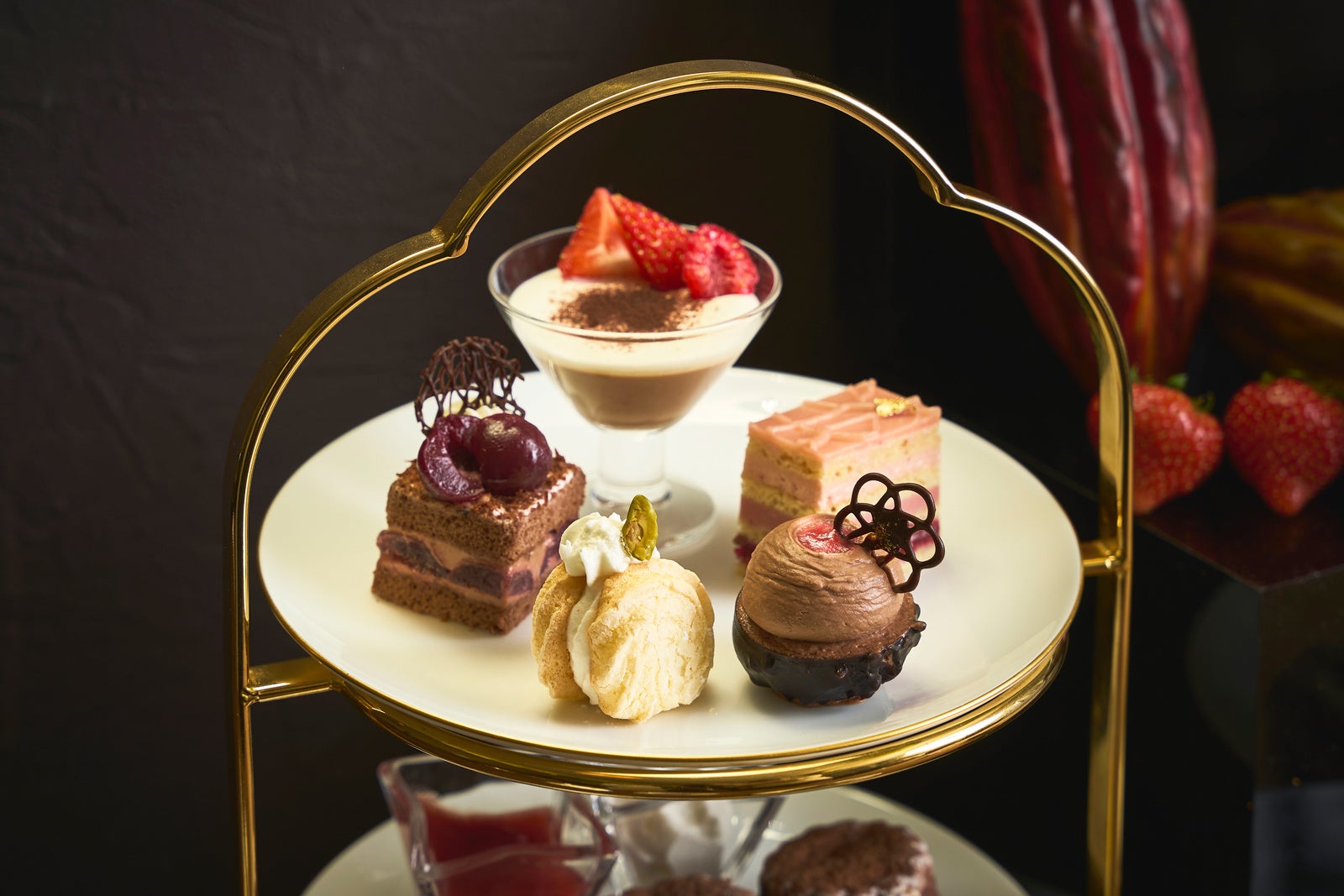 3段のティースタンドには、カカオ分35%から66%まで、個性豊かなチョコレートを使用した9種類のスイーツをご用意。上段には、ブラックチョコを使ったパンナコッタにいちごとラズベリーを添えた一品や、ジョコンドとルビーチョコのガナッシュ、苺のバタークリーム、ラズベリージャムが層になった華やかなオペラ。カカオ分66%のブラックチョコで作るフランには苺を入れて焼き上げ、チョコレートシャンティを絞りました。ゆずの皮を練り込んだダコワーズ生地にゆずのフルーツクーベルチュールチョコのガナッシュとゆずピールを挟んだダコワーズサンドは、爽やかな香りが特徴です。チョコジェノワーズにミルクチョコのシャンティとチェリーをサンドしたフォレノワールも、クラシックな味わいをお楽しみいただけます。