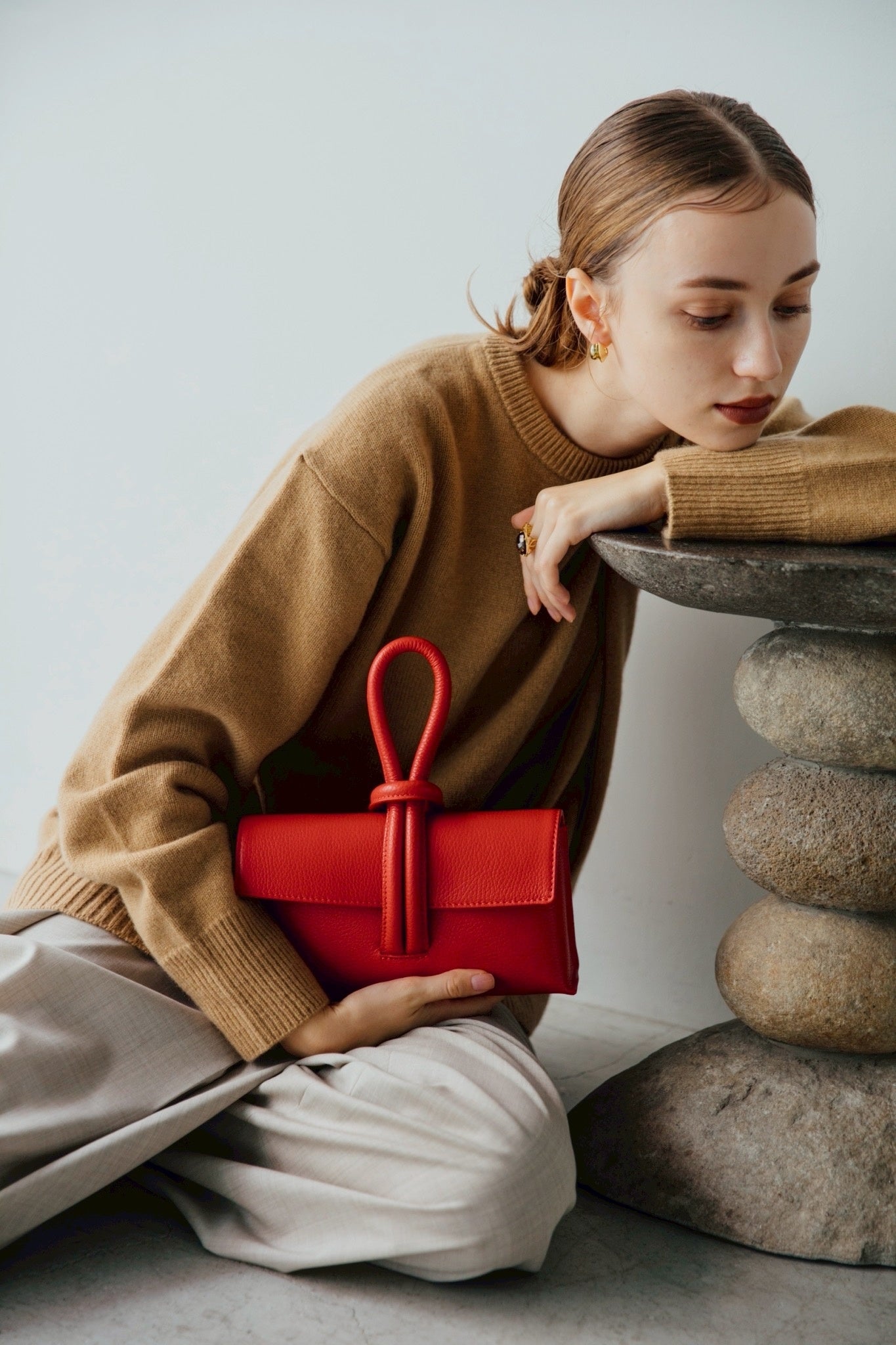 セカンドコレクションで登場した「loop」は、アイコニックでコンパクトなデザイン。イタリアンレザーならではの綺麗な発色が見い力です。柔らかなレザーを使用していて、斜め掛けに出来るストラップも付いています。
