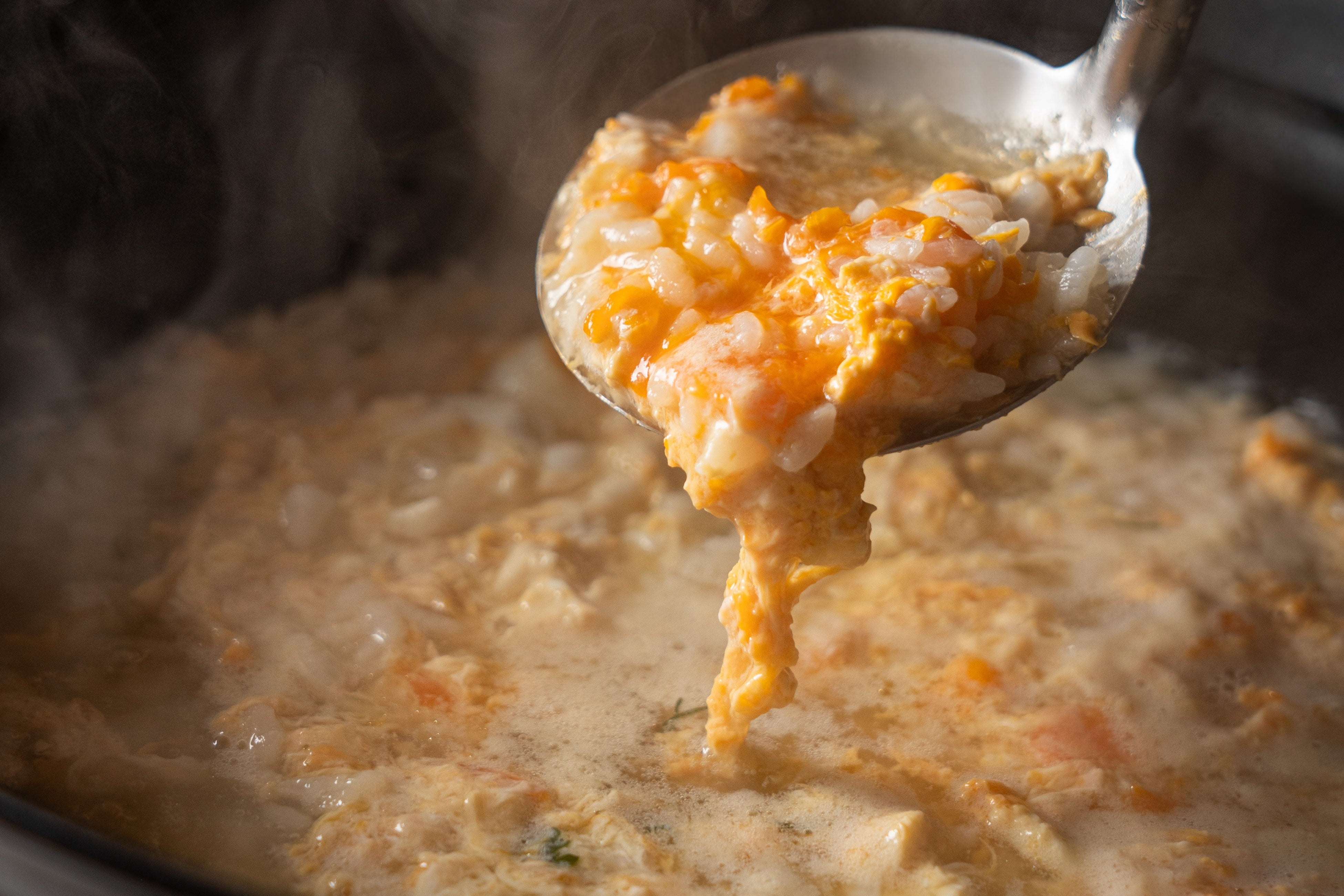 〆は塚田農場のこだわり卵「塚だま」を使用した「塚だま雑炊」(528円)。九州の旨味たっぷりのスープで仕上げる雑炊は〆までほっこり優しい味わいです。