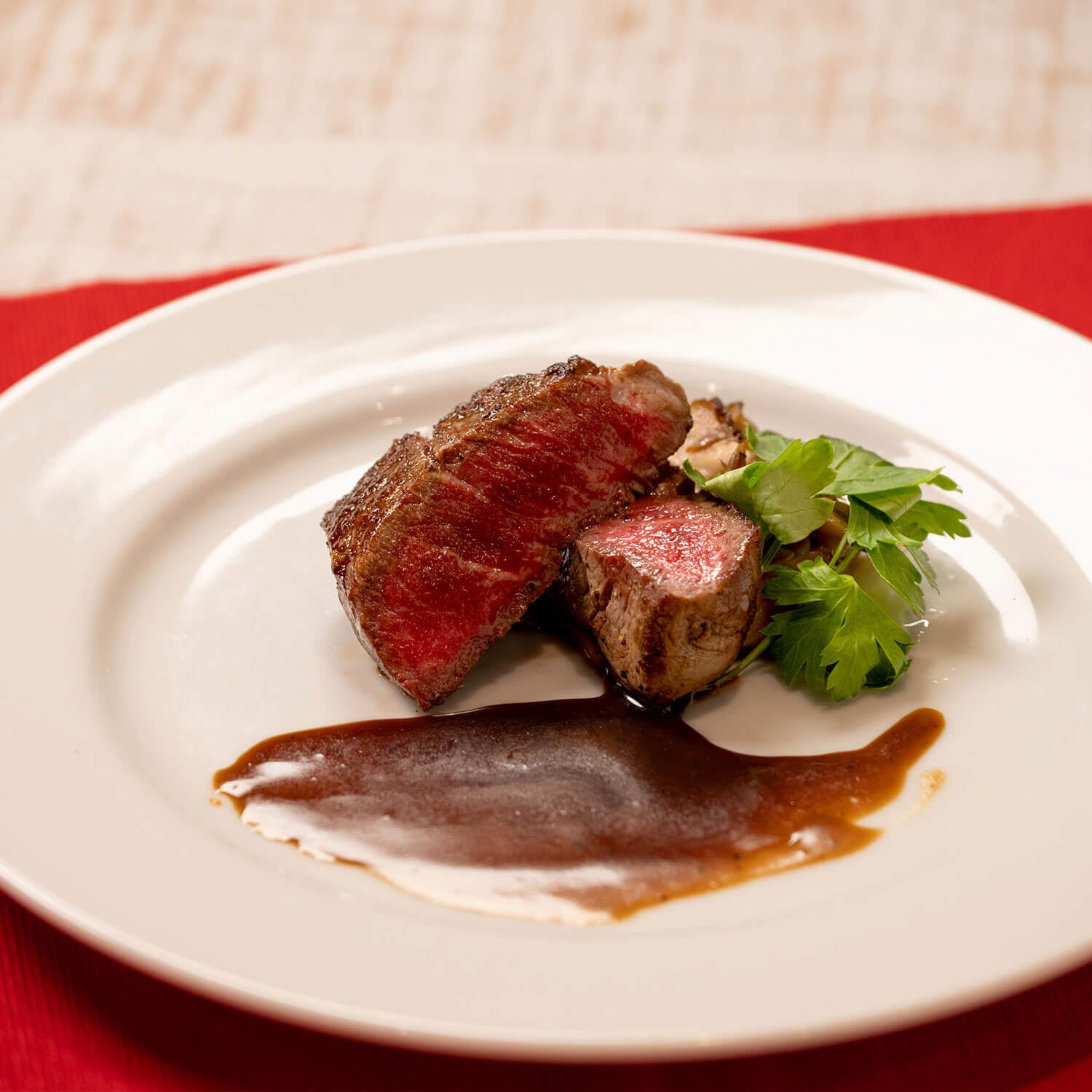〈牛フィレステーキ キノコのソテー添え マデイラワインソース〉