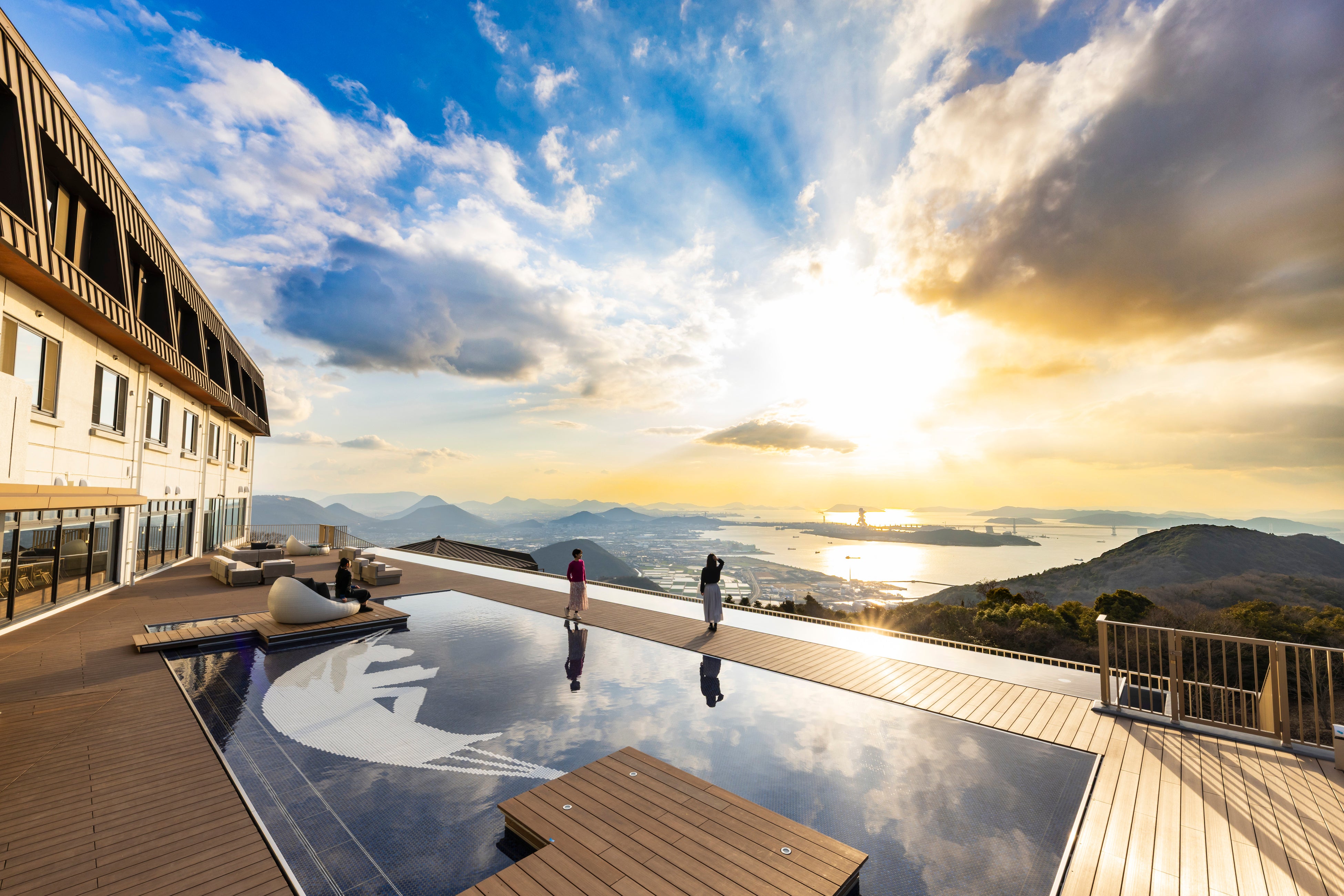 香川県の絶景「父母ヶ浜」をオマージュして設えた水盤を備えた約400平方メートル の「水鏡テラス」。刻々と変わる空が水面に映り込む光景をご覧いただけます。