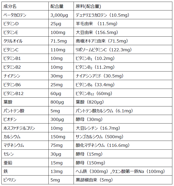 11種類のビタミンと5種類のミネラルに加え、カロテノイド、ビタミン様物質、オメガ3系脂肪酸など、全21種類の栄養素をバランスよく配合しています。日本人女性の食生活を鑑み、欠乏を防ぐだけでなく、不足予防に必要な量を考慮した設計としています。