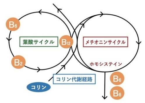 葉酸は、赤ちゃんの正常な発育に欠かせないチームで働く栄養素です。葉酸サイクルやメチオニンサイクル、コリン代謝経路がスムーズに回転すること(右図参照)が、妊娠や出産において非常に重要です。そのため葉酸が十分に摂取できていても、ビタミンB2・B6・B12、コリンのいずれかが不足すると、これらのサイクルがうまく働かず、「チーム」としての力が低下してしまいます。そこで本サプリでは、葉酸に加えて葉酸と連携して働く栄養素をバランスよく配合しました。