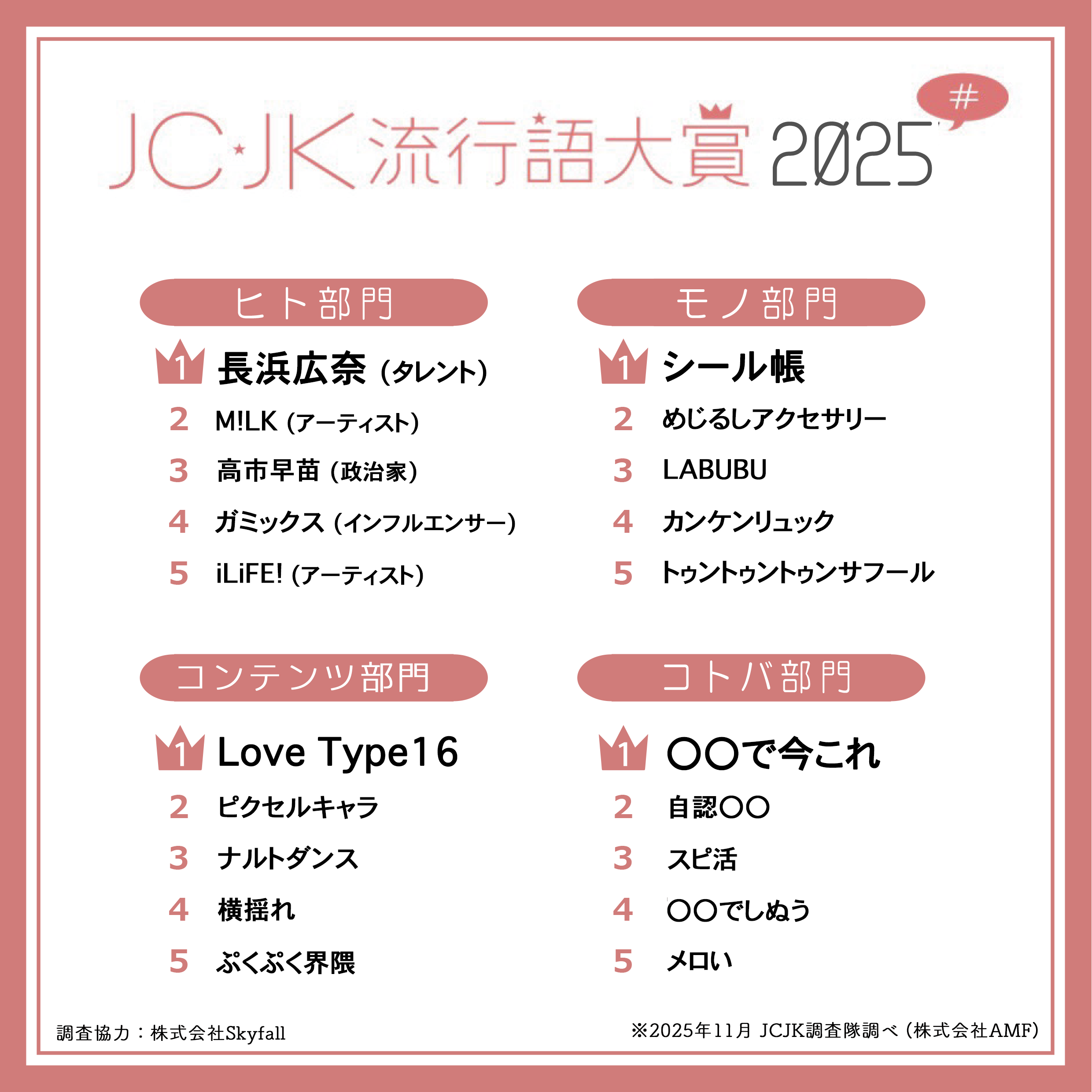 2017年にスタートした「JC・JK流行語大賞」は、Z世代マーケティングの先駆者である株式会社AMFが主催・運営する、女子中高生の“リアルな感性”をもとに選出される唯一のトレンドアワードです。 選考には、Z世代の市場調査に強みを持つSkyfall社との共同で実施された、全国の女子中高生約1,000人を対象としたアンケート結果と、日々トレンドを追うマーケティング集団“JC・JK調査隊”の精鋭メンバーによる選考を反映。SNSで実際に使われている言葉やアイテム、話題のコンテンツ、注目の人物まで、4部門にわたり“共感度の高い流行”を可視化しています。 発表後には、SNSインプレッション初日1.9億回超/年間広告換算額25億円超と、企業・メディア双方から高い注目を集める、日本を代表するZ世代トレンド指標のひとつです。