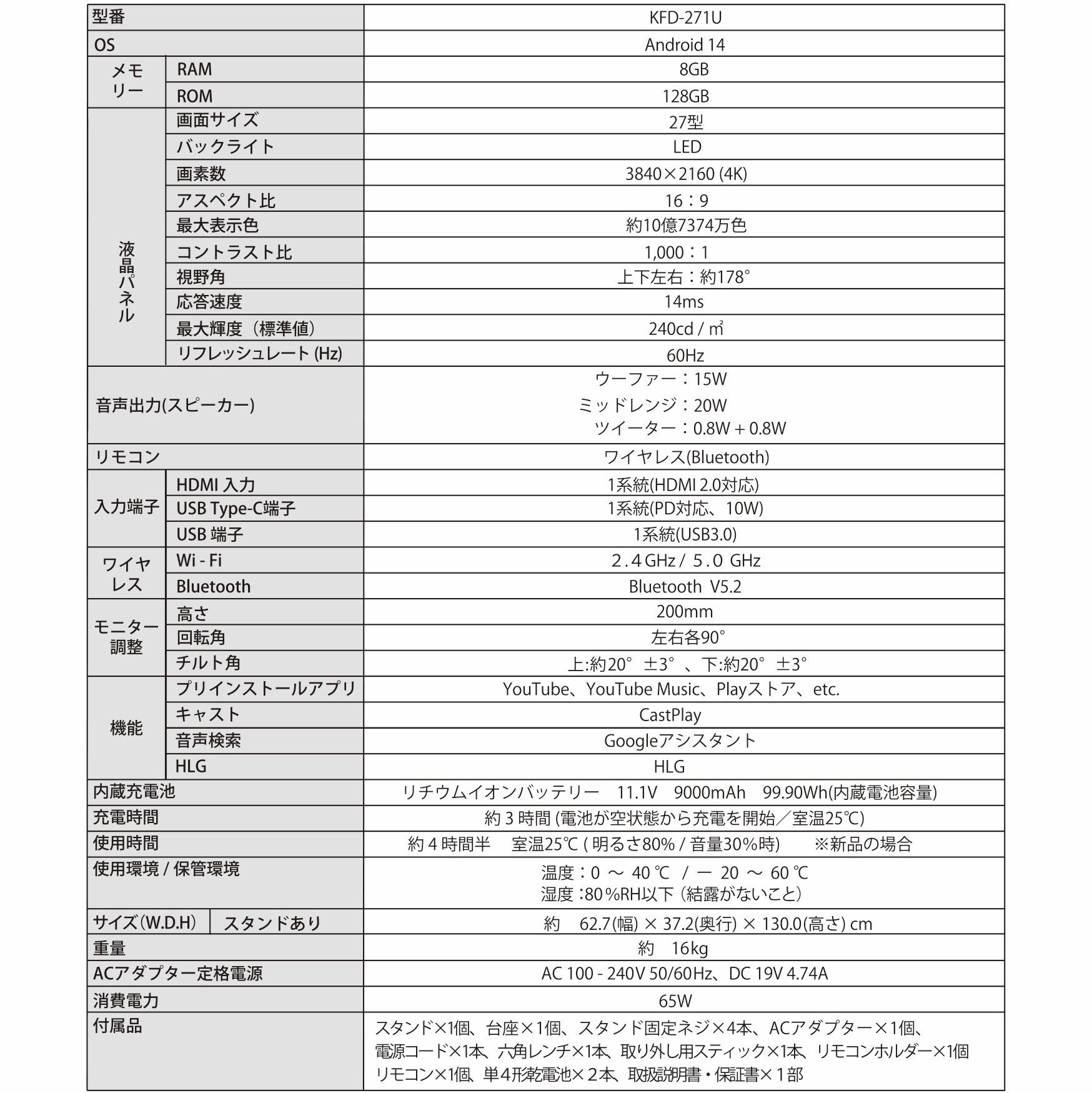 本製品は、Androidタブレットの使いやすさをそのままに、画面を27インチまで大きくし、さらに一般的なフルHDの4倍の解像度を誇る4Kパネルを搭載することで、動画・写真・文字を高精細に表示します。タッチパネルを搭載しているため、スマートフォンやタブレットと同じ感覚で直感的に操作でき、検索やアプリ操作もスムーズです。4Kパネルを採用することで、高解像度で動画を楽しむ事はもちろん、細かな文字やレシピ、フィットネス動画の動作までも鮮明に表示し、長時間でも快適に視聴できます。