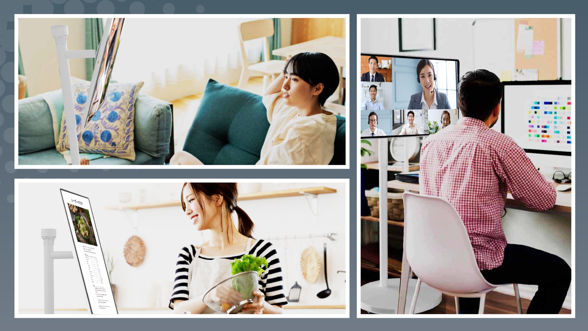 本体にはバッテリーを内蔵し、キャスターも付いているため家中どこへでも自由に移動できます。キッチン、リビング、寝室、ワークアウトスペースなど、場所に縛られず、用途に応じた最適な場所で使用できます。また、カメラも内蔵されているため、ビデオ会議を行ったりケーブルを繋げばサブモニターとしても使用可能です。