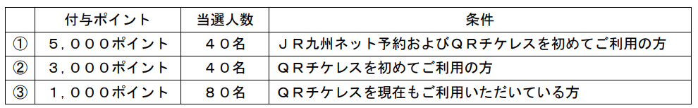 鹿児島エリア・宮崎エリアを「出発駅」もしくは「到着駅」とするきっぷで、キャンペーン期間中にQR チケレスで乗車されたお客さまを対象に、抽選でJRキューポを最大で5,000ポイントプレゼントしま す。事前のキャンペーンの申し込みは必要ありません。2 キャンペーン期間