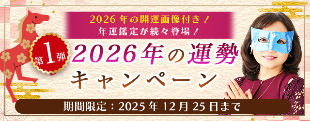 『2026年の運勢キャンペーン』では、2026年の運勢を占う鑑定が続々登場。この対象鑑定をご購入された方全員に、2026年の干支 “丙午(ひのえうま)”がモチーフの「2026年の開運画像」をプレゼント致します。 「成功」「行動力」「繁栄」を象徴する動物として古来より西洋・東洋ともに親しまれてきた“午(馬)”が描かれた開運画像です。ぜひこの機会にGETして、2026年の運気アップにお役立てください。