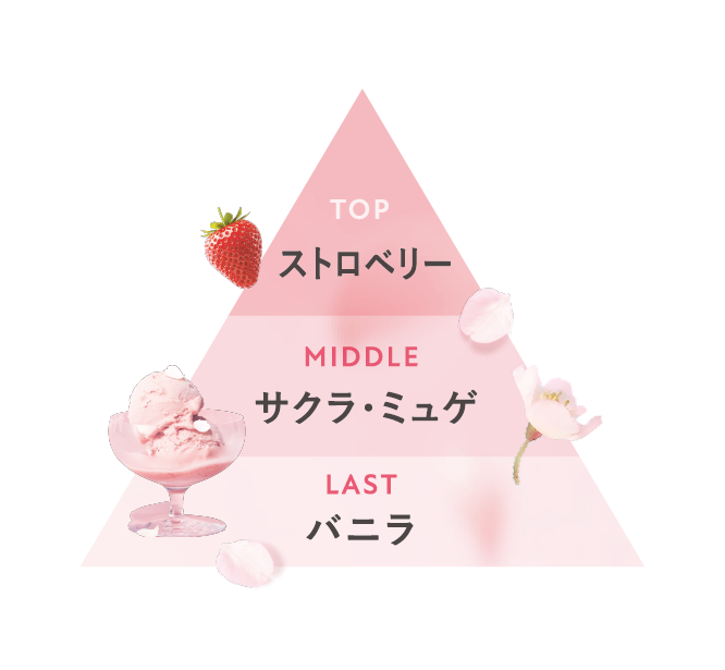 ・サクラ:サクラ品種の中でも、香り高い大島桜の香気成分をブレンド。可憐な華やかさもありながら、みずみずしく香りが広がる。