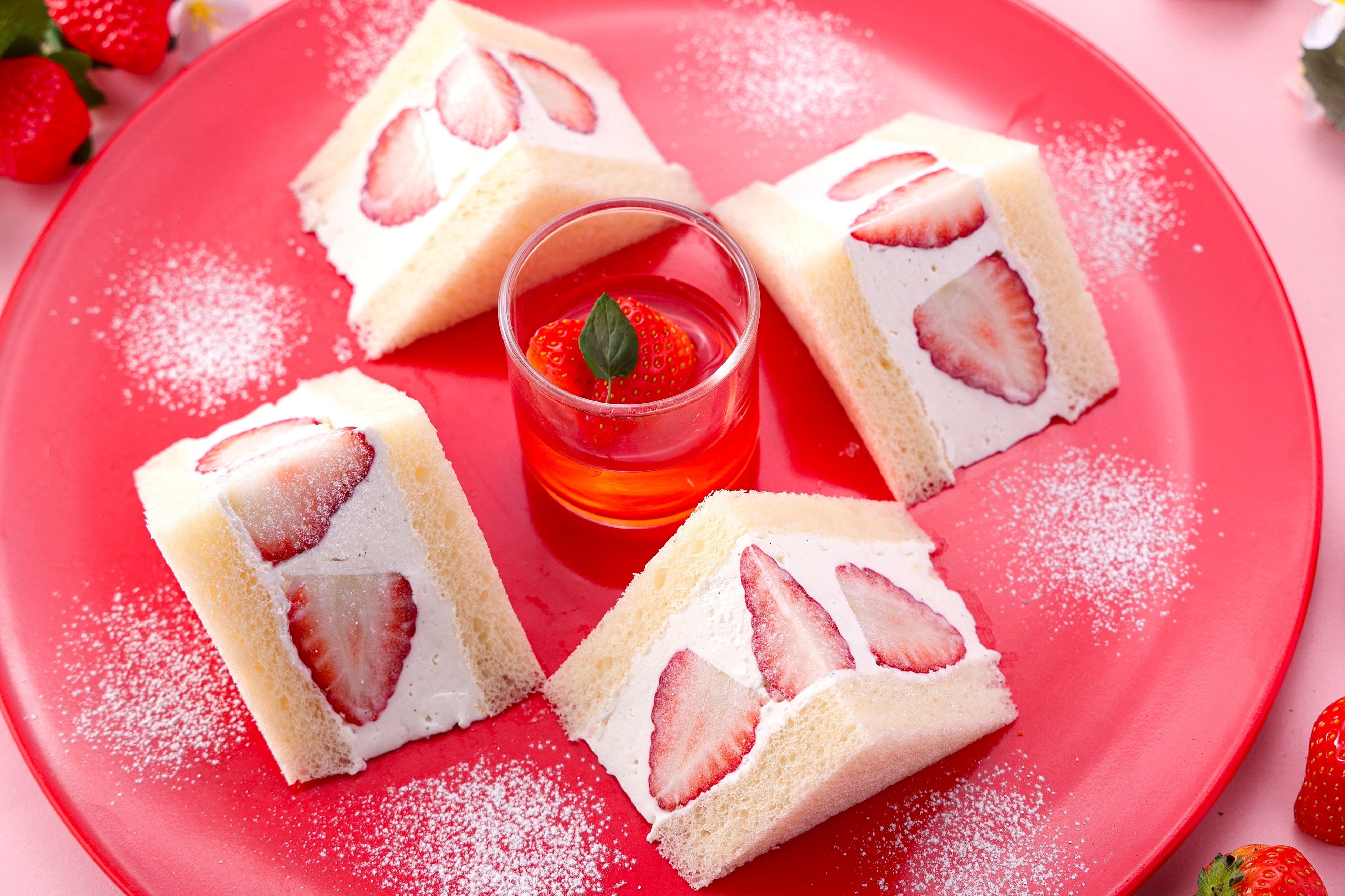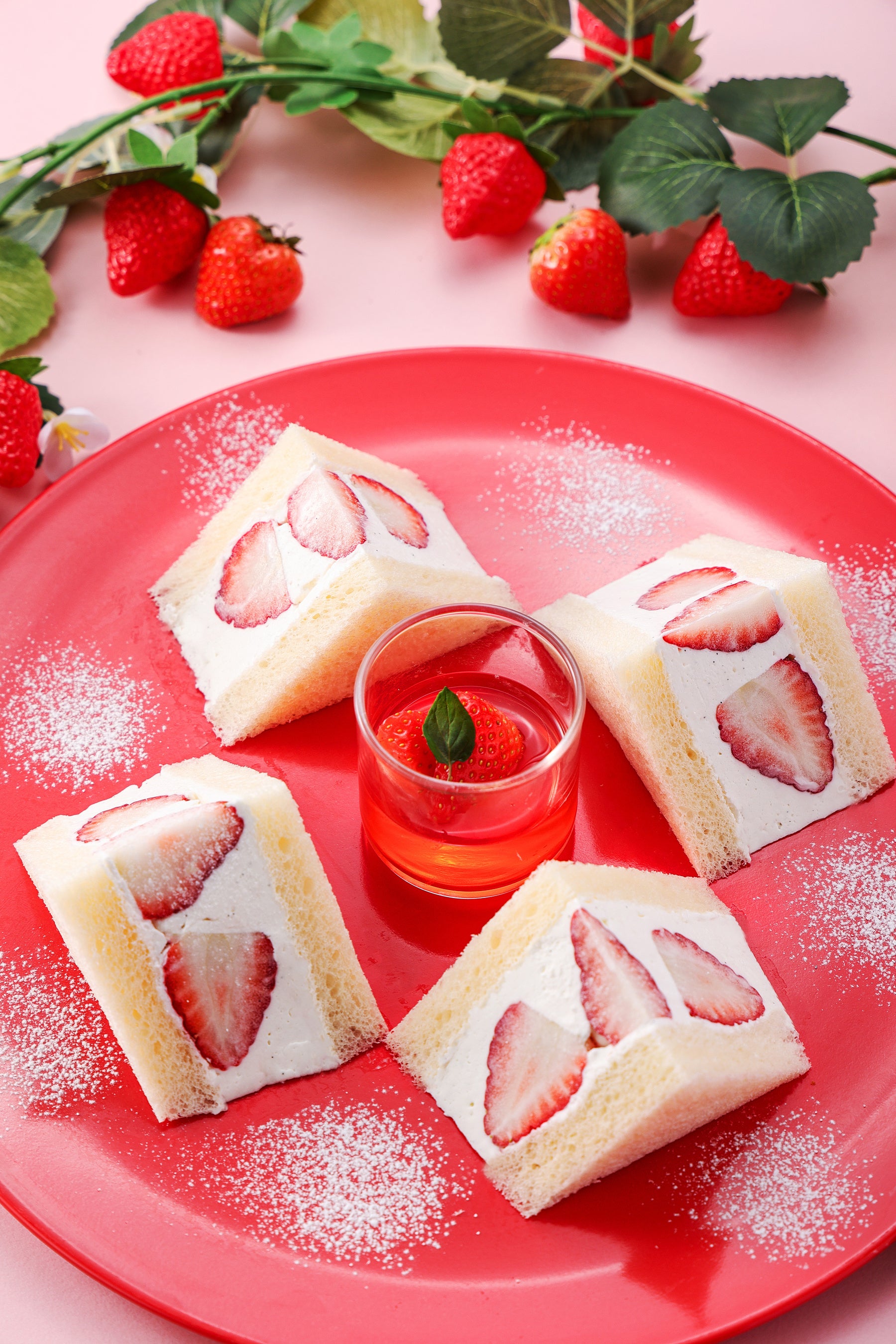 今年も旬を迎えるいちごをふんだんに使用した『ストロベリーサンドウィッチ』が登場!甘酸っぱさが広がるフレッシュいちごを、ホテルメイドのふわふわパンとくちどけ滑らかなクリームで華やかにサンドしました。美しい断面に思わず見惚れてしまうほど。さらに中央にはいちごゼリーを添え、濃密な果実感と奥深い甘酸っぱさの余韻をお愉しみいただけます。ルビーのように輝く断面、口いっぱいに広がる芳醇な甘み、そして見た目にも華やかな仕上がりは、まさに“頬張る度に幸福度が増すご褒美スイーツ”。いちごならではの心安らぐ香りとジューシーな食感で、甘いひとときをお過ごしください。