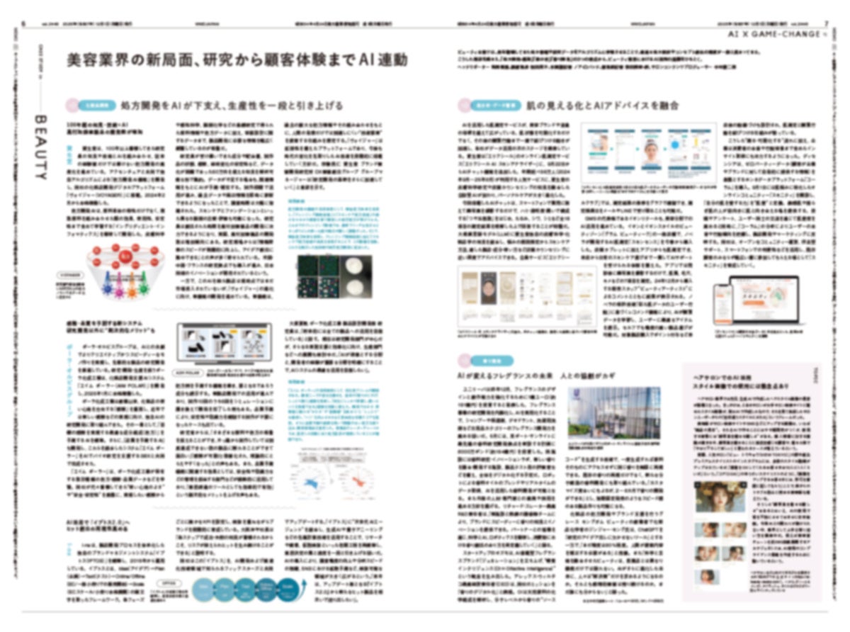 一方ビューティ編では、資生堂やポーラ化成が蓄積知をAIで構造化し、処方開発の精度とスピードを大幅向上。肌分析AIと会話型AIを掛け合わせた“肌診断+購買“の一連体験や、イオンによる店頭AIカウンセリングの導入など、美容とAIの接点も深化している現状を総力レポートしています。