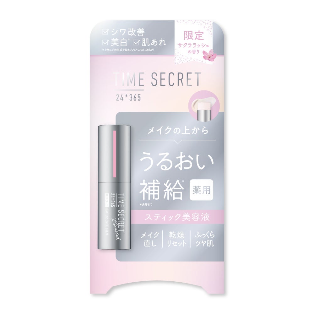 「タイムシークレット 薬用デイエッセンスバーム」は、有効成分ナイアシンアミド配合のスティック美容液です。美白*²・シワ改善・肌あれ防止を叶えながら、ストレッチパウダーが小じわや毛穴をふんわりカバー。マスクの擦れから肌を守り、肌トラブルを防ぎます。