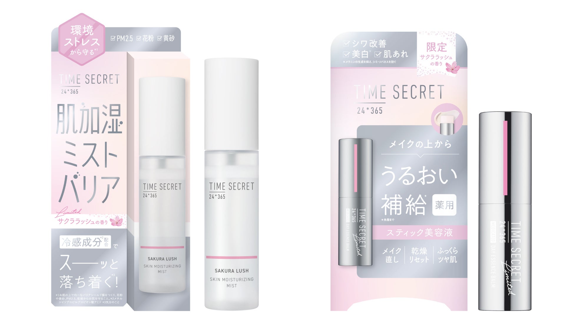 msh株式会社は、ミネラルコスメブランド「タイムシークレット」より、花粉・黄砂・PM2.5・乾燥などの環境ストレスから肌を守る*¹「タイムシークレット 肌加湿ミスト バリア サクララッシュの香り」と、肌あれ防止・保湿ケアをしながら美白*²&シワ改善するスティック美容液「タイムシークレット 薬用デイエッセンスバーム サクララッシュの香り」を2025年12月16日(火)に数量限定で同時発売します。