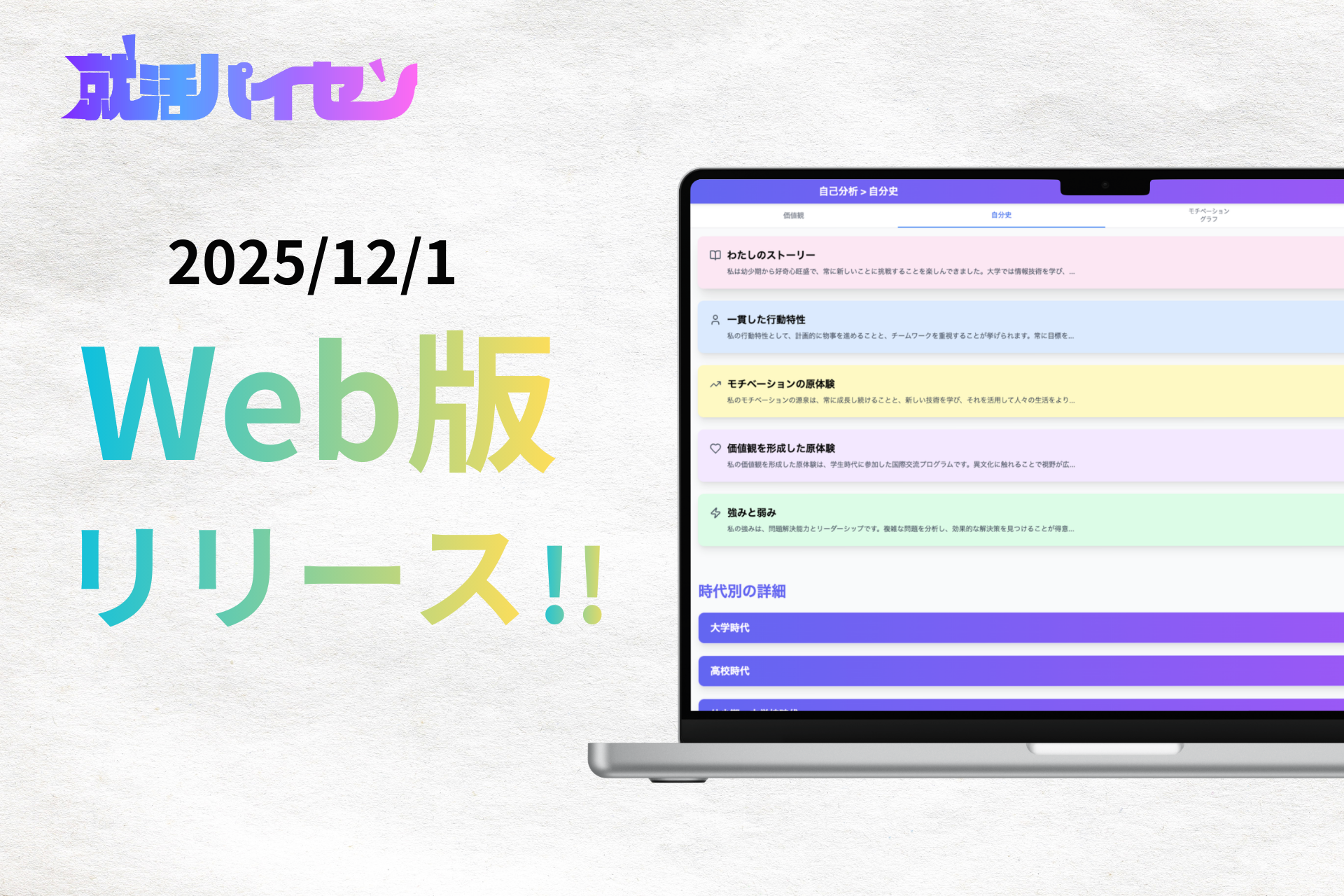 yoake株式会社(本社:千葉県、代表取締役:小田井宏文)が運営する就活特化型AIサービス「就活パイセン」は、2025年10月時点で登録ユーザー数が1万人を突破しました。広告費に依存せず、主にSNSなどのオーガニック流入により、直近半年間で約7,000人の新規登録を獲得しています。 また、本格化する就職活動シーズンに合わせ、2025年12月1日(月)よりWeb版(PCブラウザ版)を正式リリースいたしました。これにより、LINEでの手軽な自己分析からPCでの本格的なエントリーシート(ES)作成まで、就活準備を一気通貫で完結できる環境が整いました。