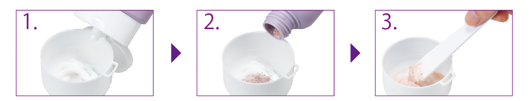 2.ボトルの上部を持って傾け、上の人差し指でボトルを軽くたたいて、粉状のマスクを必要量だけティースプーンへ振り出します。(ボトルそのものを振ると、中身が使用料より多く出ることがあるのでご注意ください)