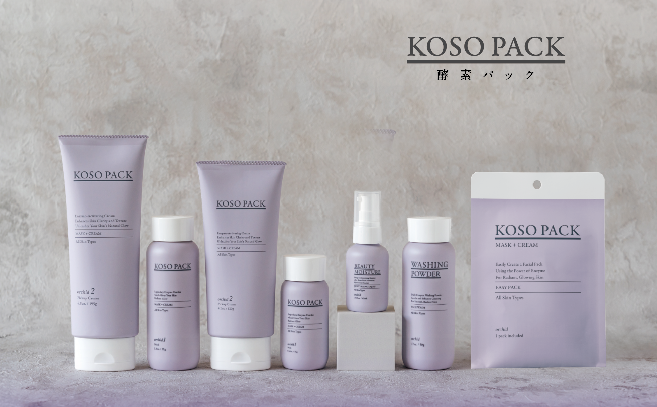 オーキッドシリーズ左から マスク、ピックアップクリーム、酵素パックセットのピックアップクリーム。酵素パックセットのマスク、ビューティモイスチャー、洗顔パウダー、ピックアップマスク