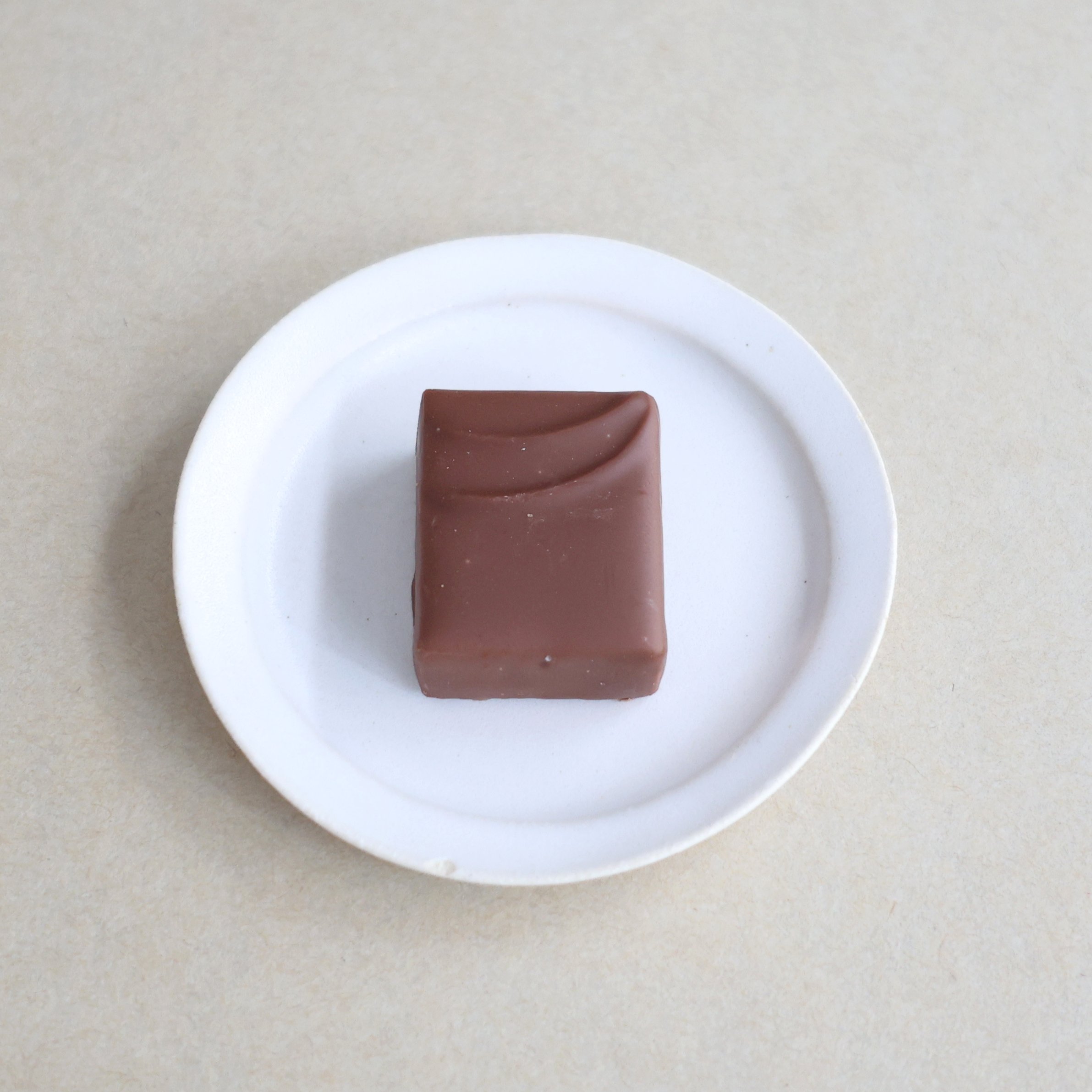 ヘーゼルナッツペーストとアーモンドにキャラメルを合わせてガナッシュでコーティング。濃厚でなめらかなミルクジャンドゥーヤです