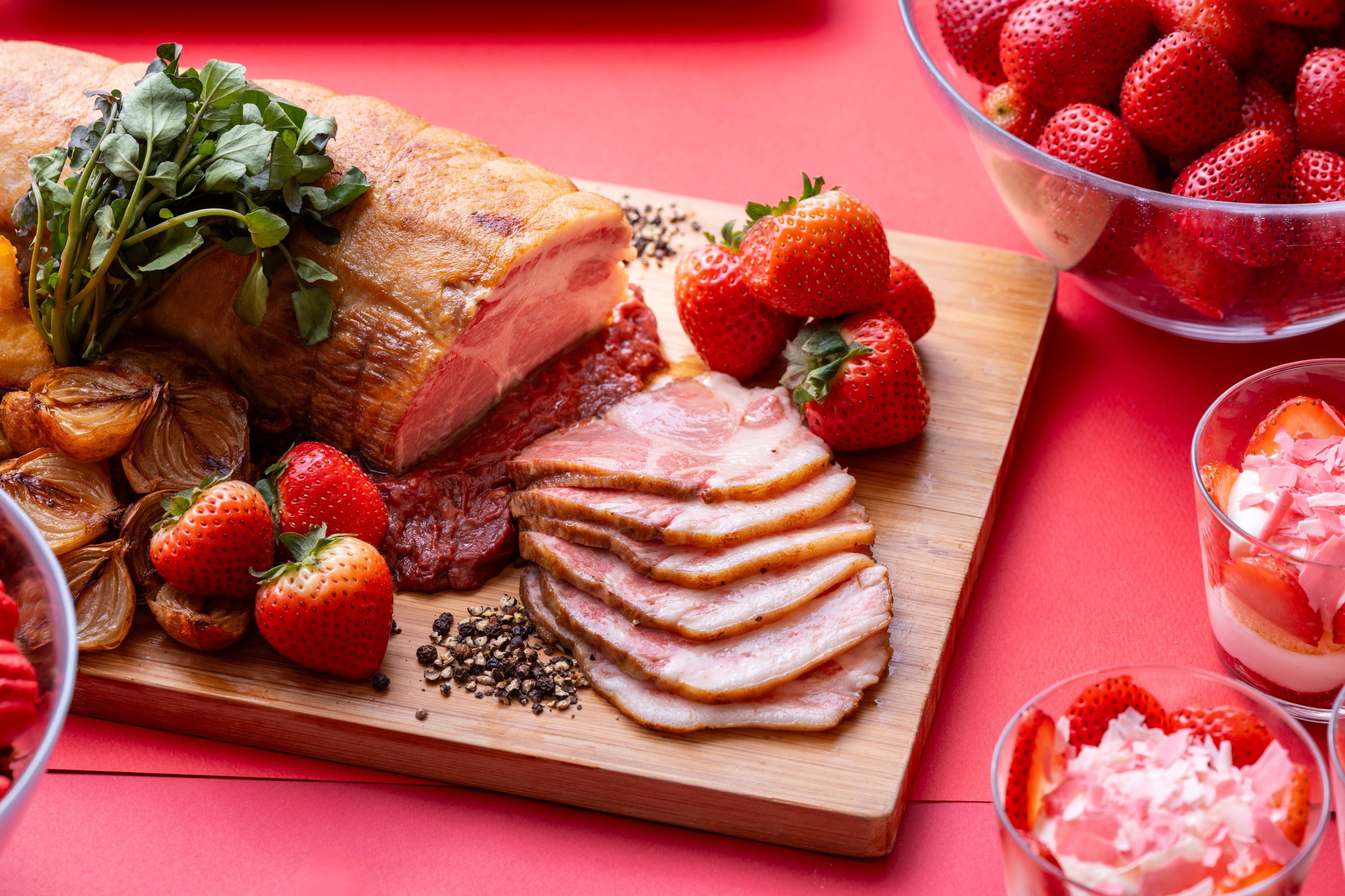 サラダバー /カフェ33サラダ、ローストチキンとドライストロベリー / スモークサーモン、コンディメント各種 / スイートポテトフライとチキンフィンガー / ローストポーク フォカッチャサンド、ローズマリー、ローストチェリートマト、エクストラバージンオイル、ドライストロベリーパウダー / ミニキッシュ / チーズと苺のパイ包み / セイボリー最中 / 苺とバルサミコのリゾット / フジッリ、クリームソース、ソテーしたキノコ、マスカルポーネチーズ、ドライトマト、アンチョビ / 丸鶏ローストチキン、フェタチーズと苺のサルサ / ローストポーク、苺とトマトのチャツネ / ローストポテト、クリスピーベーコン、パルメザンチーズ