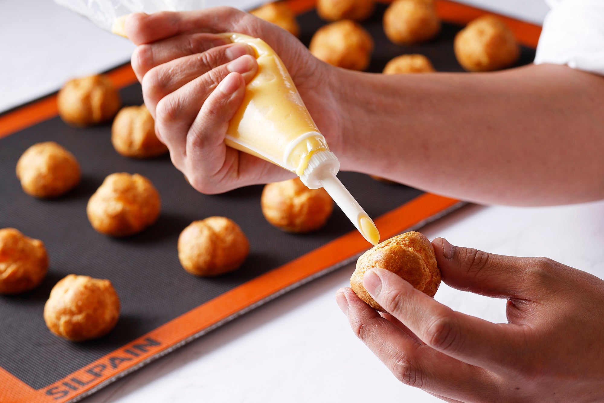 焼きたてシュークリームは、カスタード又はいちごカスタードから選べる