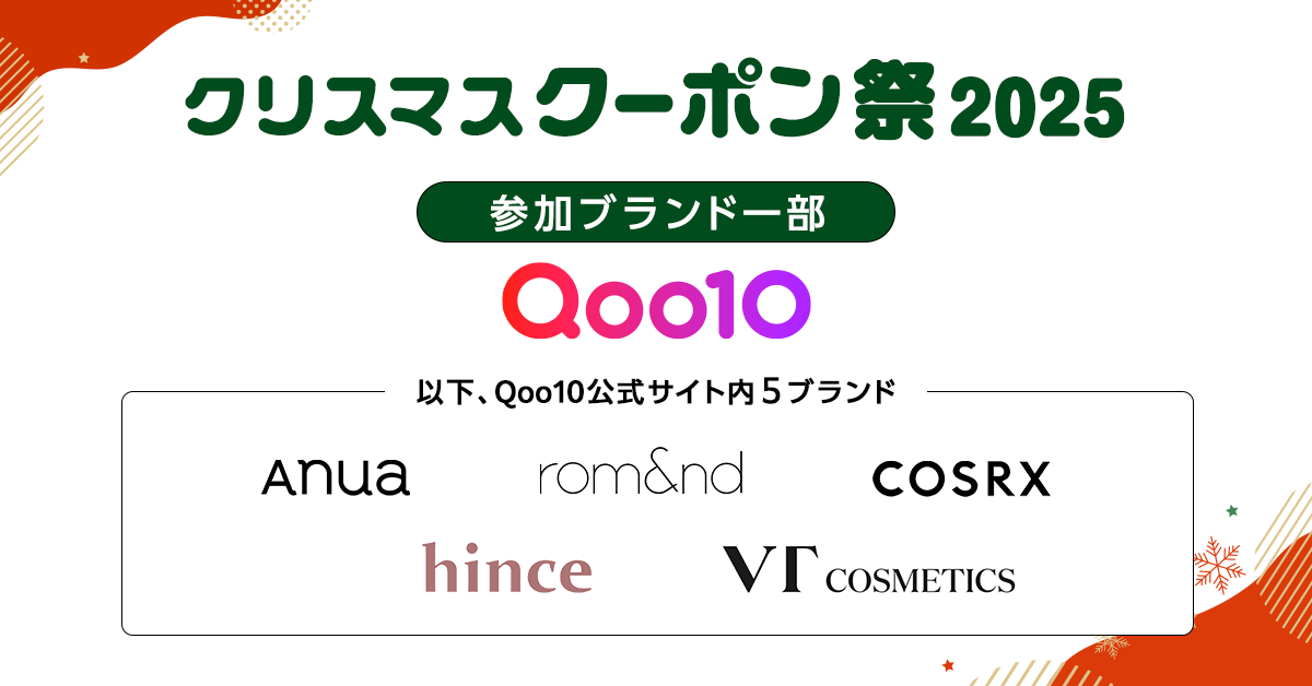 今年はクーポン祭としては初めて美容関連商品が人気のオンライン総合ショッピングモールの「Qoo10」が登場。またQoo10公式サイト上で韓国コスメ5ブランドの商品を購入するとさらにお得になるクーポンもご用意しました。さらに、セブン-イレブンやローソンなどの冬にうれしいコンビニクーポン、ファッション通販ベルーナでのお買い物がお得になるクーポンも登場します。クリスマスシーズンにぴったりの「自分へのご褒美体験」のチャンスをぜひお楽しみください。