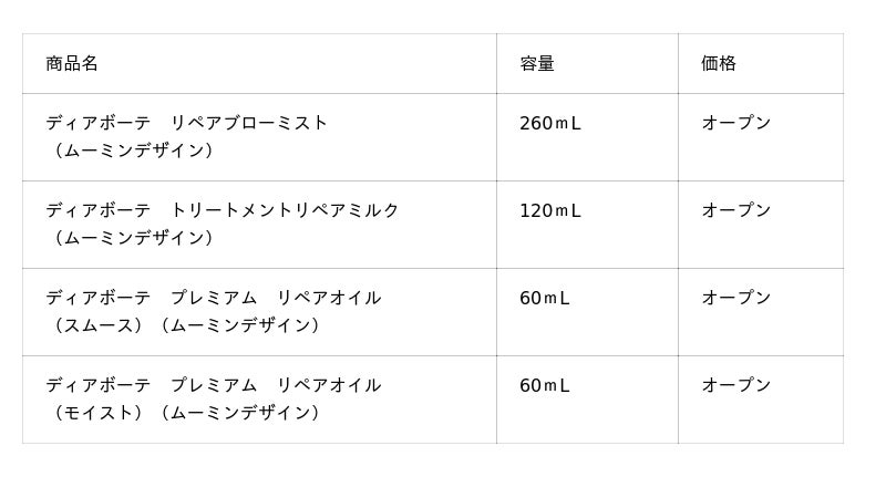 「ムーミン谷からのお便り“しあわせのおすそわけ”」をテーマに、ブラッシングやドライヤー・ヘアアイロン前に使う浸透美容ミスト「リペアブローミスト」にはスナフキン。しなやかなうるおいが続く「トリートメントリペアミルク」にはリトルミイ。毛先までツヤ輝く、やわらかするん髪へ導く「プレミアム リペアオイル(スムース)」にはスノークのおじょうさん、しっとりまとまる髪へ導く「プレミアム リペアオイル(モイスト)」にはムーミンが描かれており、ムーミン谷から届いた“しあわせ”を使うたび感じられるデザインに仕上げました。